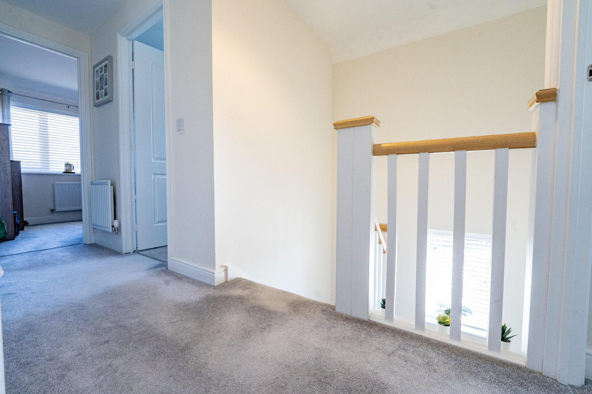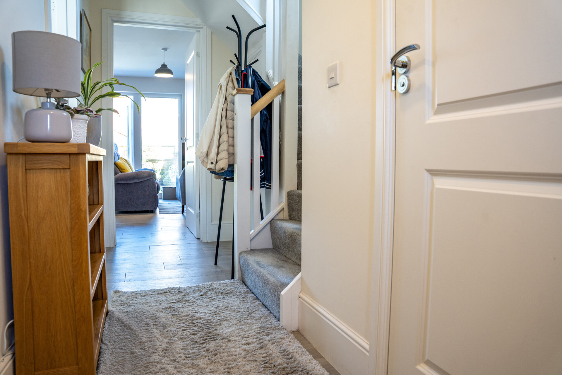 Composite front entrance door, stairs to the first floor landing, radiator, door to understairs storage and doors to