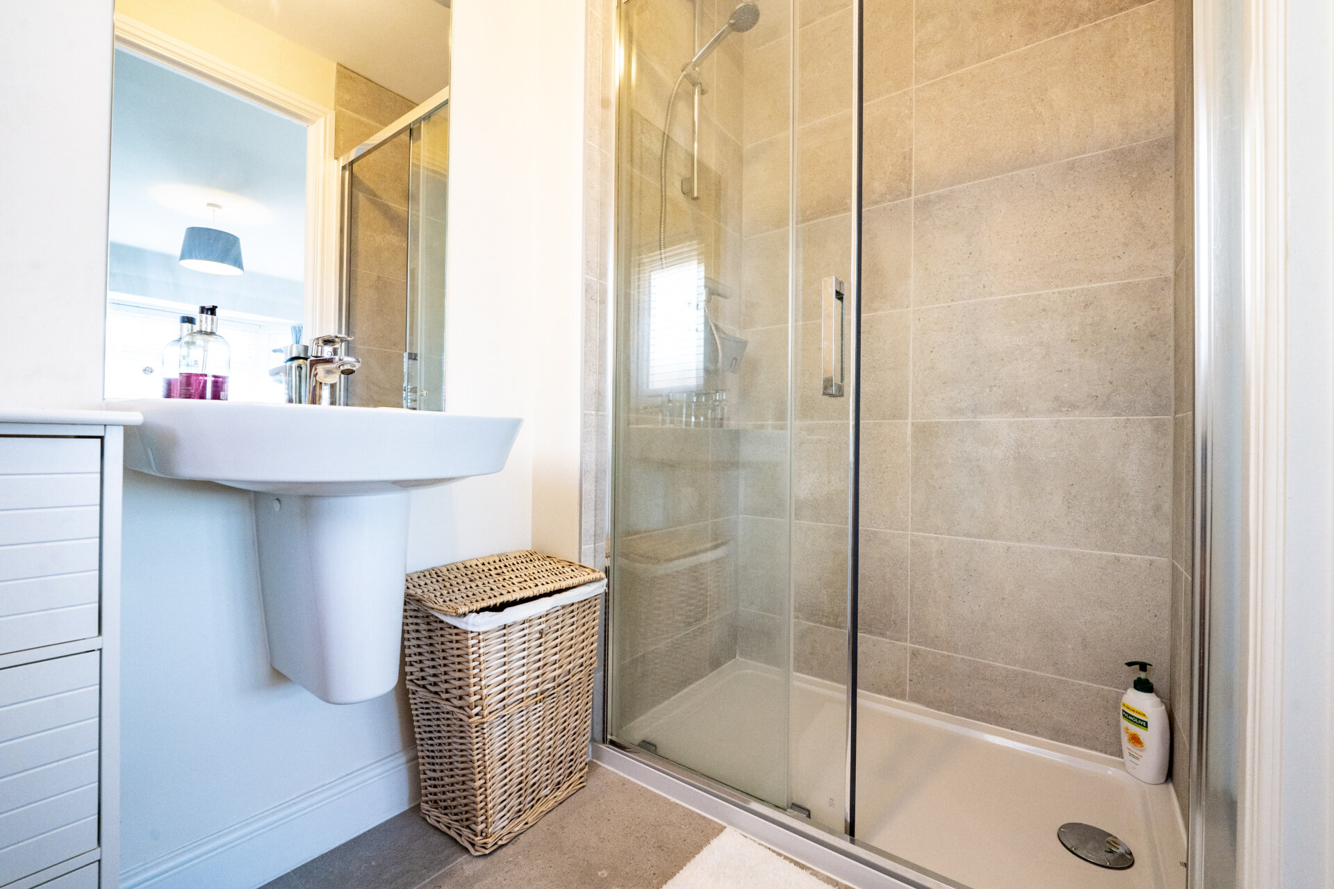 Walk-in shower cubicle with shower from the mains, sink, low flush w.c, tiled walls and splashbacks, Porcelanosa tiled floor, shaver point, chrome heated towel rail, UPVC double glazed window to the side, extractor fan.