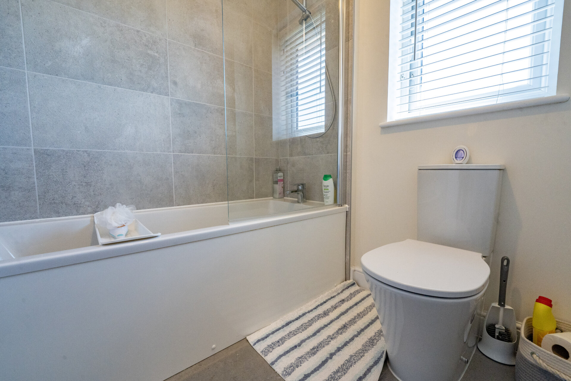 Panelled bath with shower from the mains, low flush w.c, sink, tiled walls and splashbacks, Porcelonsa tiled floor, UPVC double glazed window to the side, chrome heated towel rail.