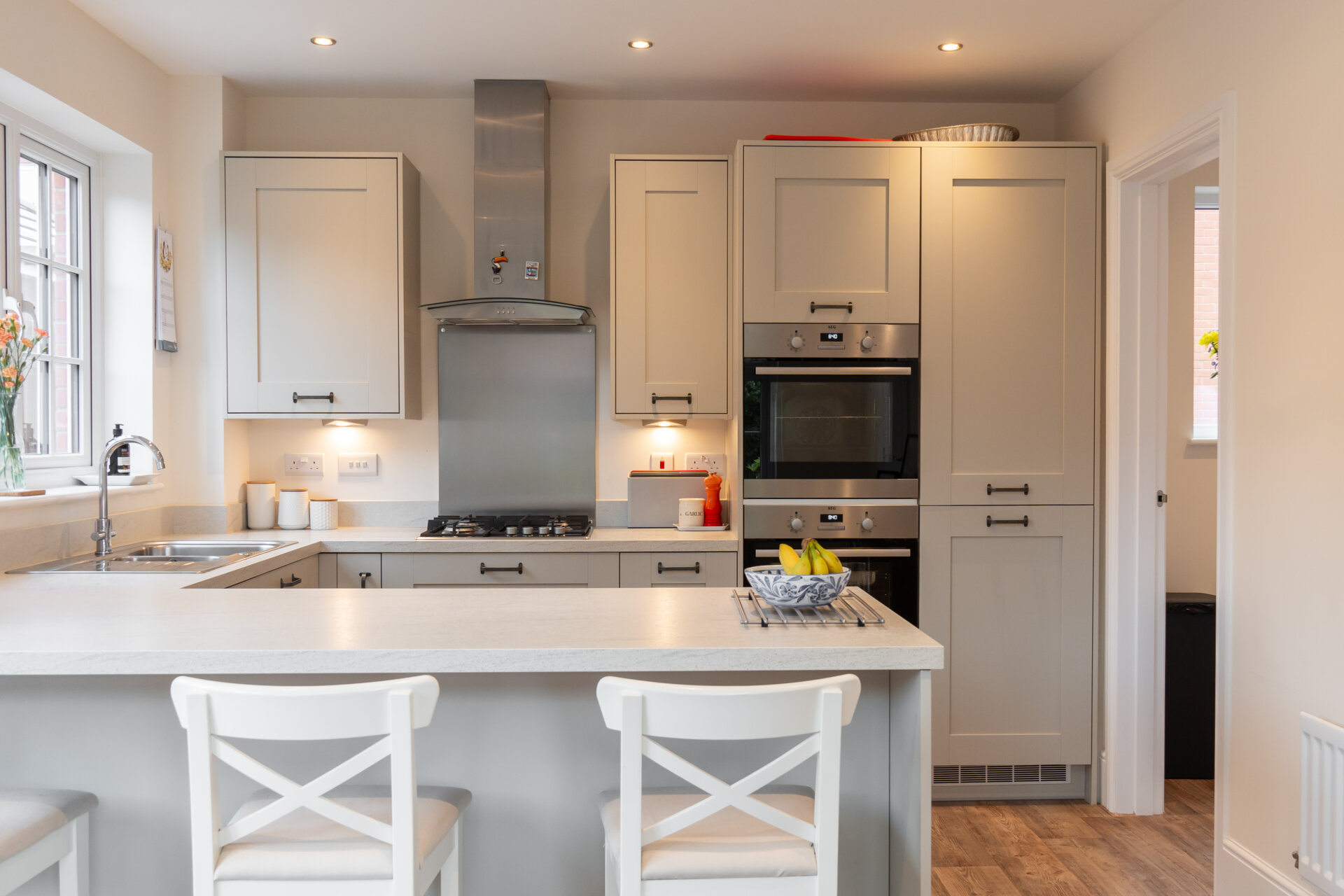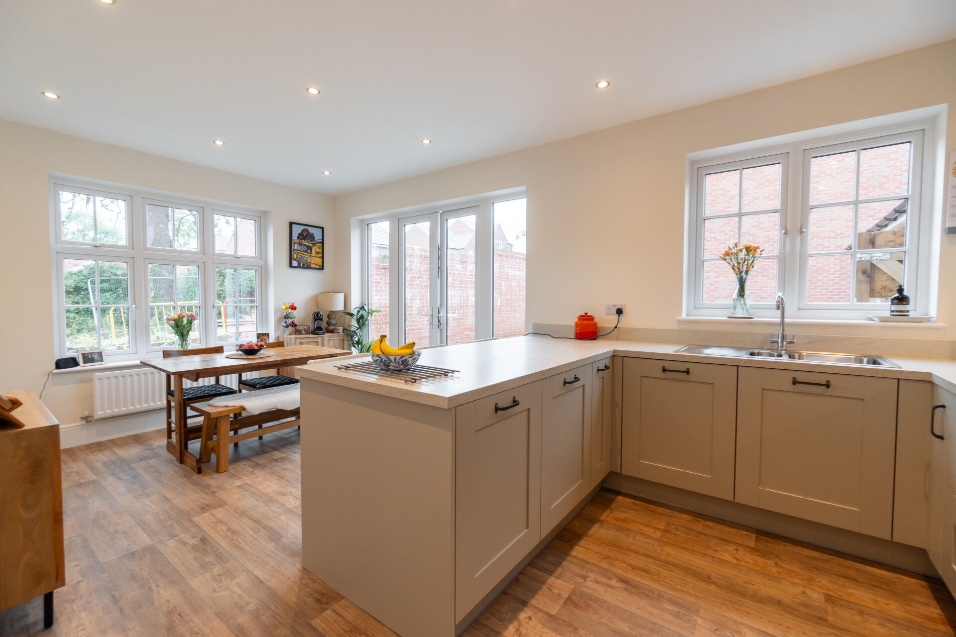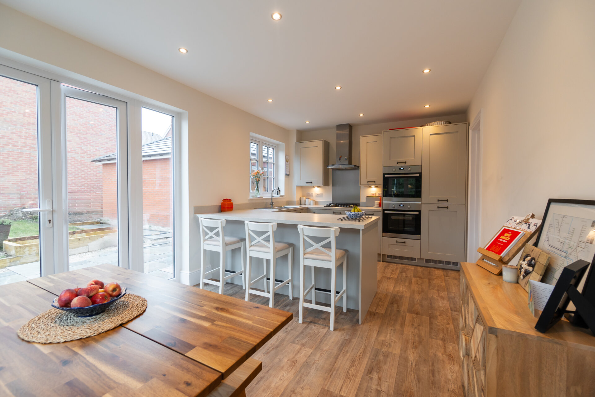 Wall, base and drawer units with work surface over, stainless steel sink/waste/drainer unit with swan mixer tap over, splashbacks, built-in dishwasher, eye level AEG double oven, electric hob and extractor over, spotlights, breakfast bar, under cupboard lighting, x2 radiators, x2 UPVC triple glazed windows and French doors onto the rear garden
