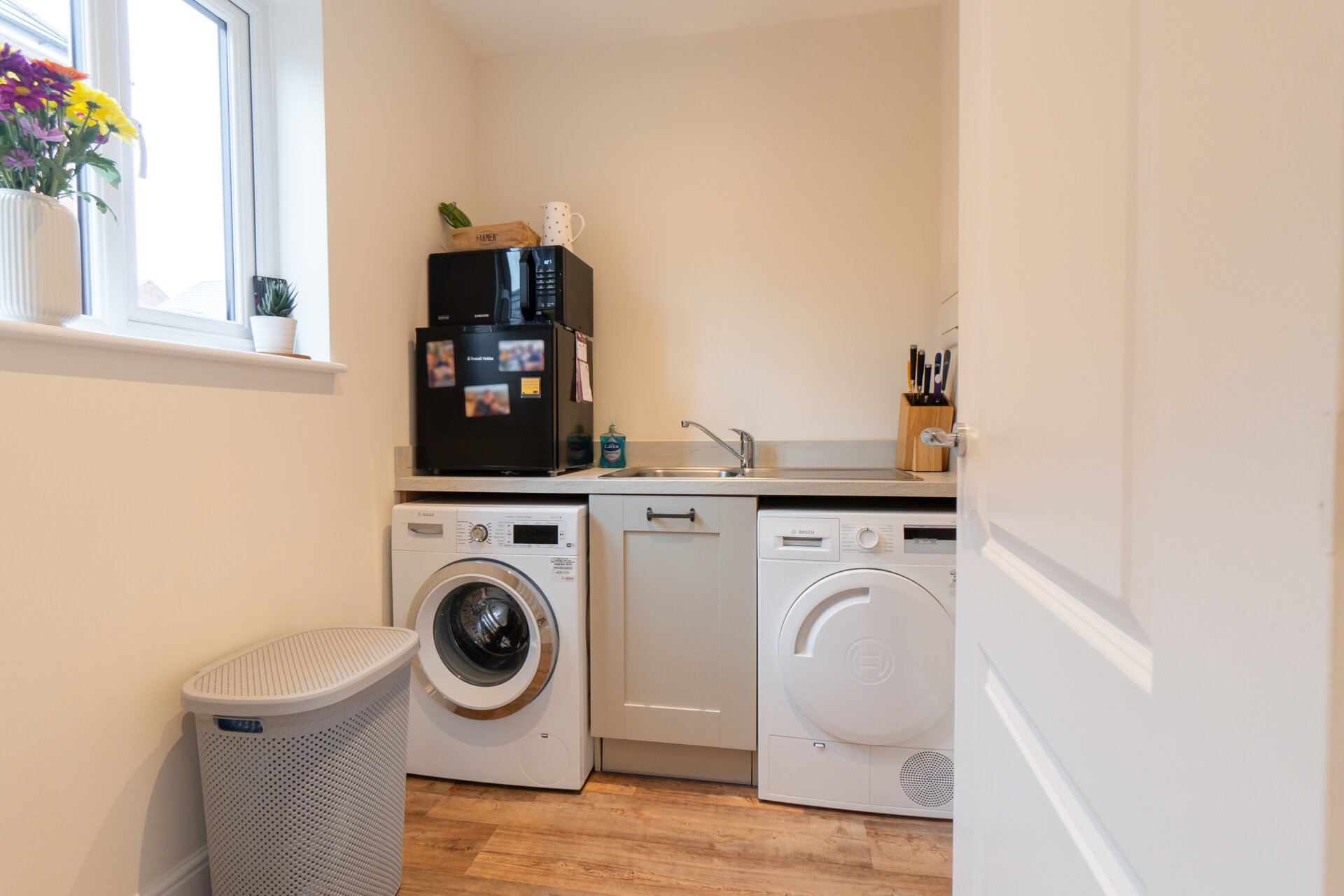 UPVC triple glazed window, plumbing for automatic washing machine, tumble dryer space, base units with work tops, stainless steel sink and drainer with mixer tap over, spotlights and door to the understairs storage cupboard