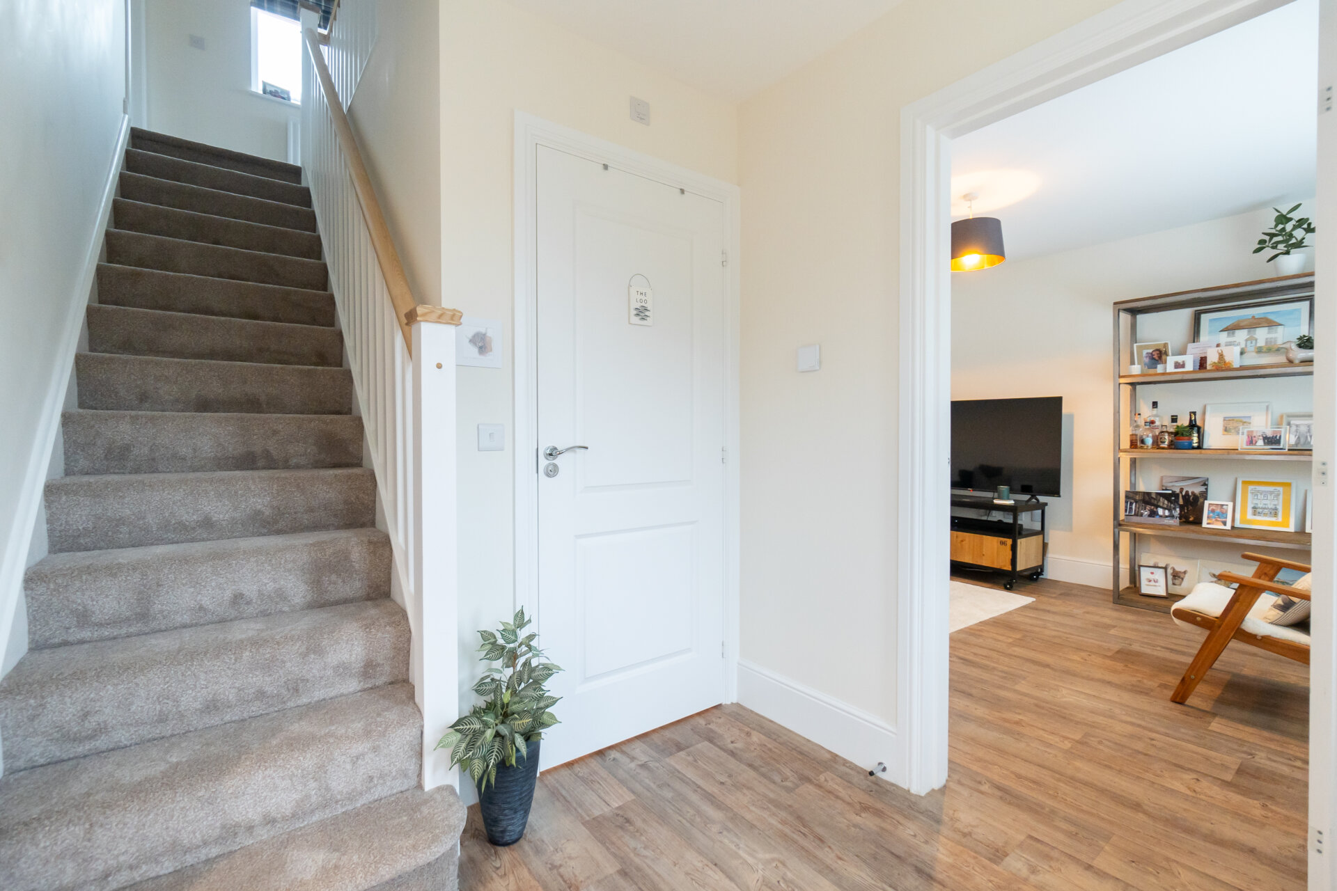 Composite front entrance door and windows, radiator, stairs to the first floor landing and doors to