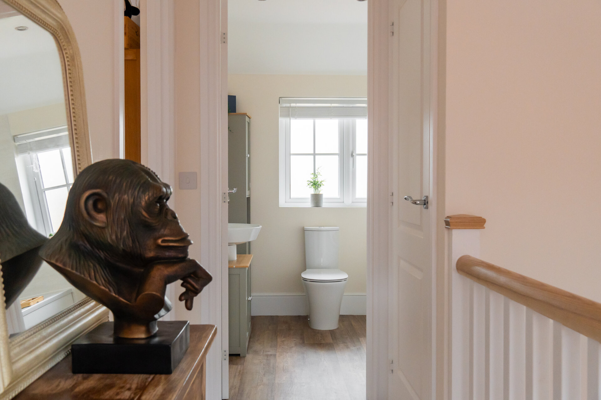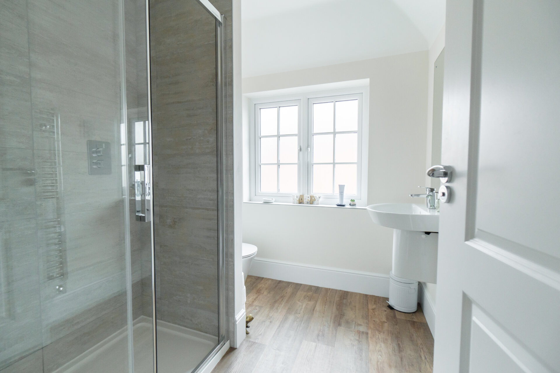 Triple glazing, panelled bath with shower from the mains, low flush w.c, sink, shaver point, tiled walls splashbacks, spotlights, chrome heated towel rail