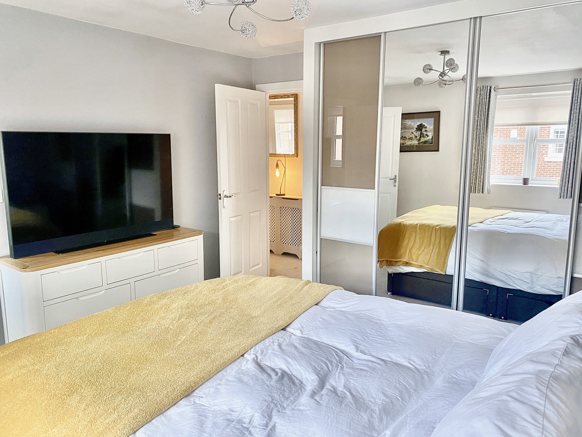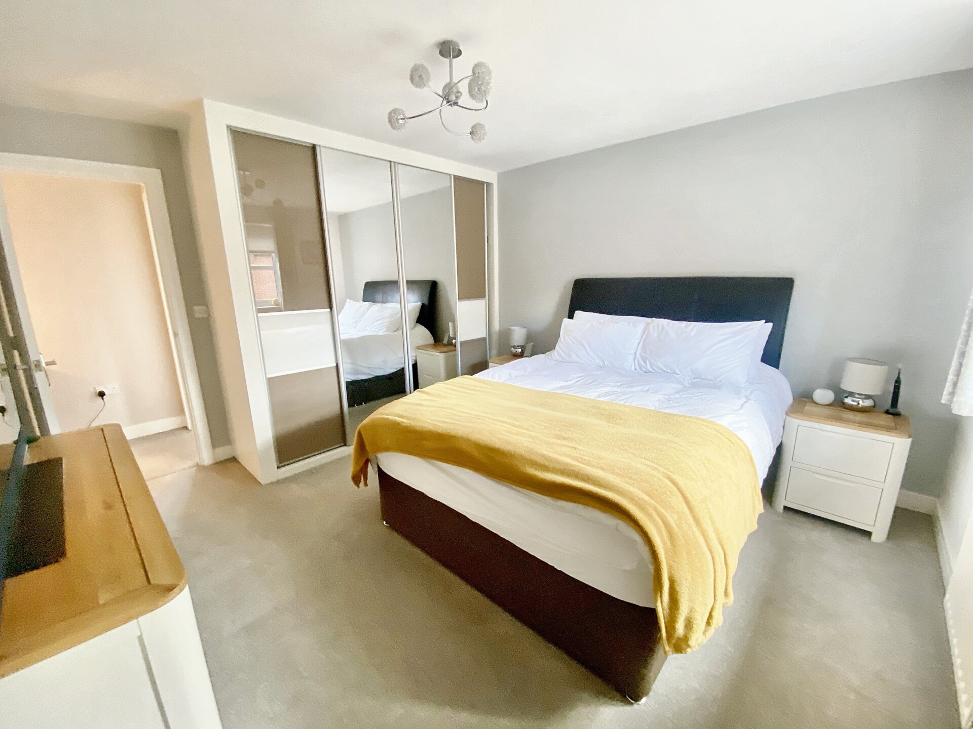 Generous kingsized bedroom. Window to the front elevation, ceiling light point, radiator, a range of built-in mirror fronted wardrobes, door into: