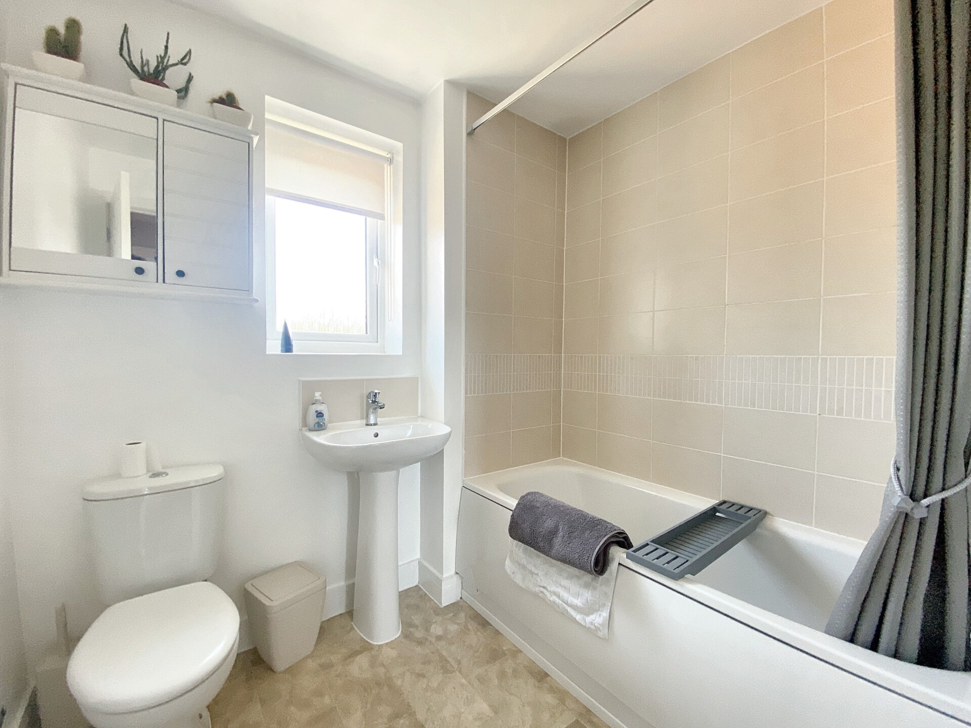 Modern white three piece suite, fitted with a low flush w/c, wash hand basin with a mixer tap, bath with a chrome thermostatic shower over, fully tiled walls over bath and shower with a modern neutral colour, chrome heated towel radiator. Window located to the rear elevation.