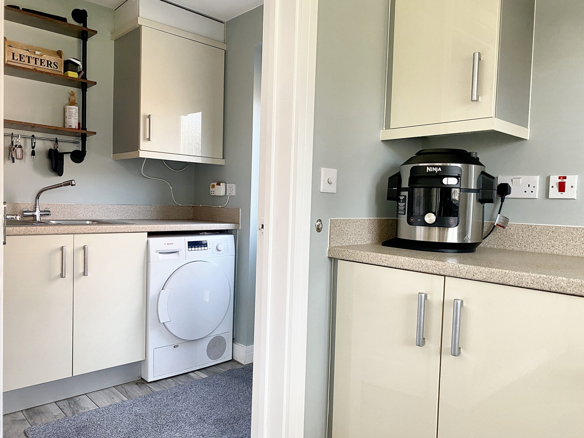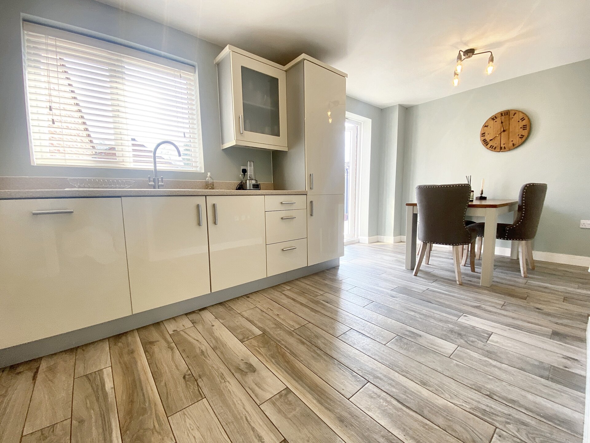 Modern high gloss slab designed units in a a range of base and wall units, stainless steel sink and drainer with chrome mixer tap over, laminate worktop and matching up-stands. With under-counter space & plumbing for a freestanding washing machine. Convenient composite side access door leading directly to the driveway.
