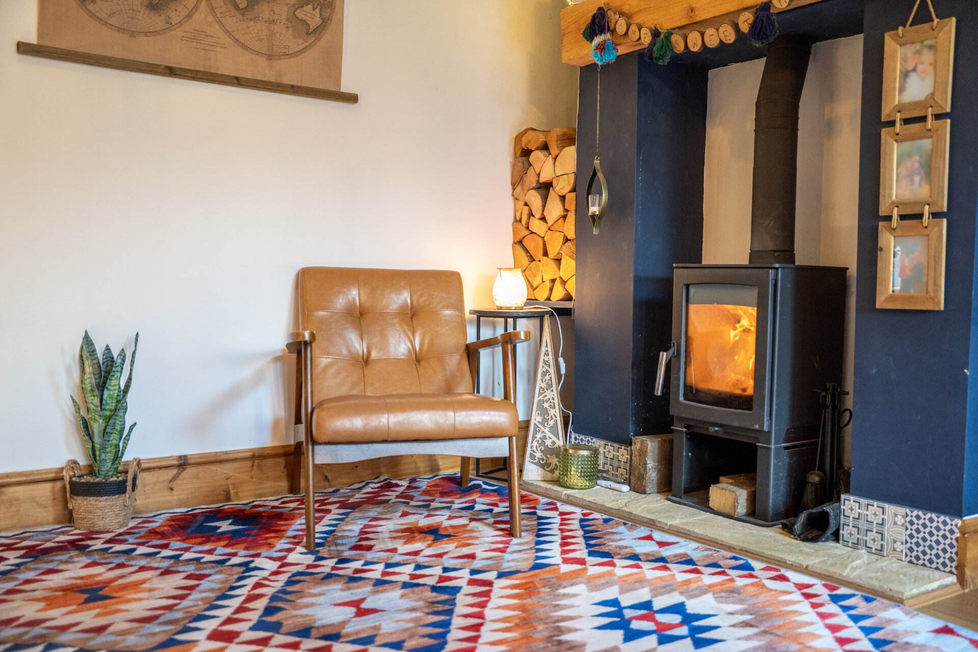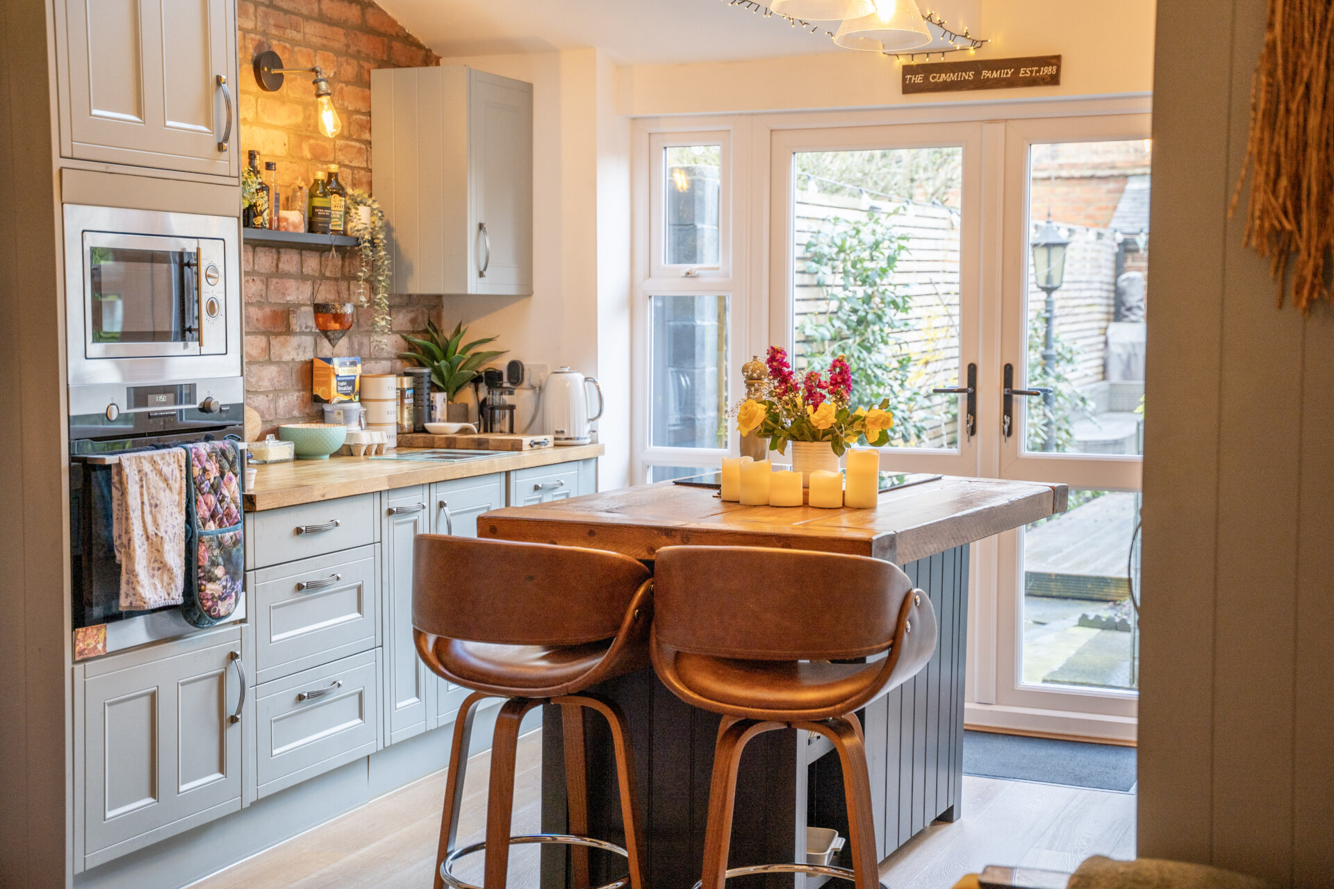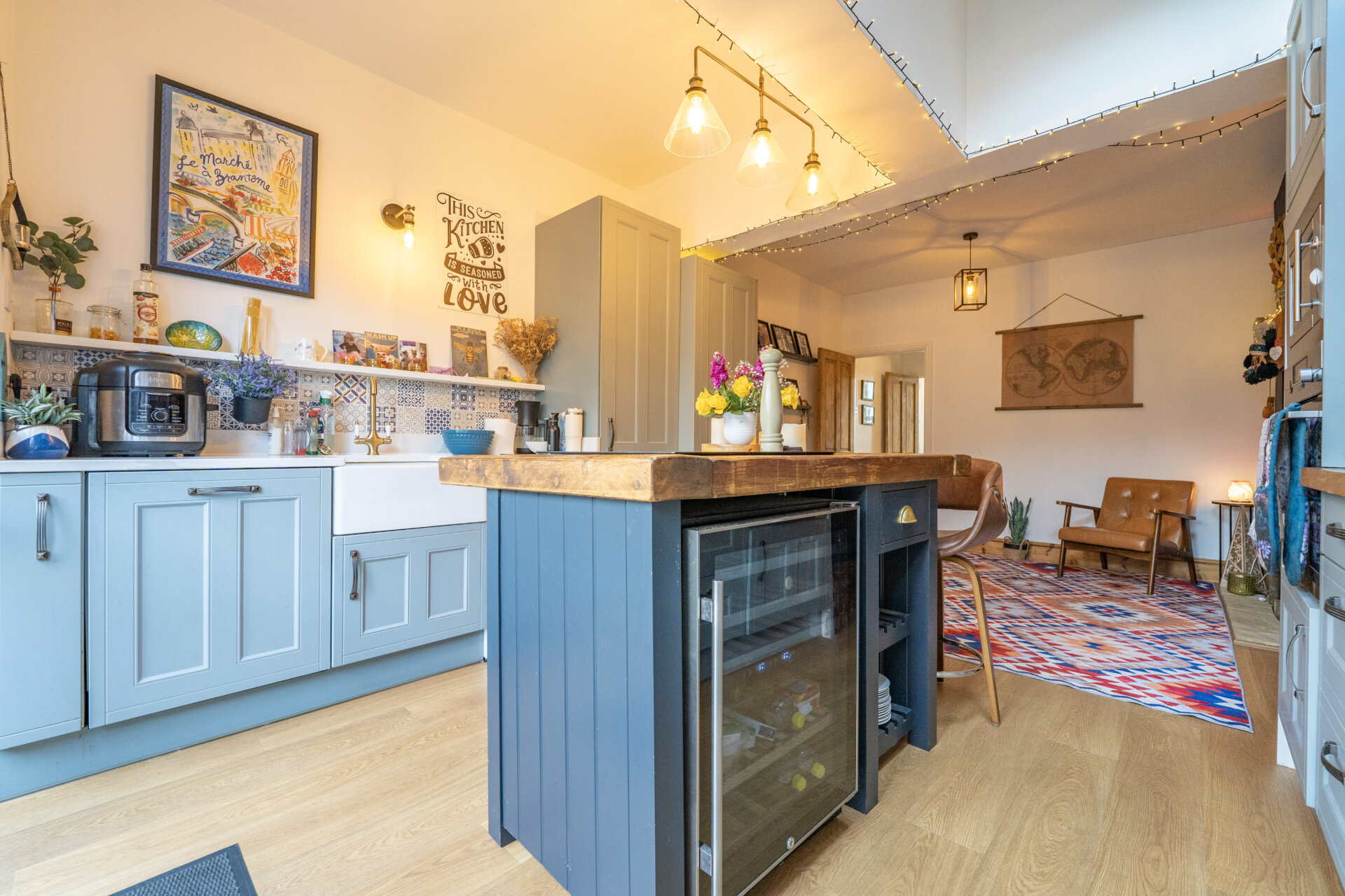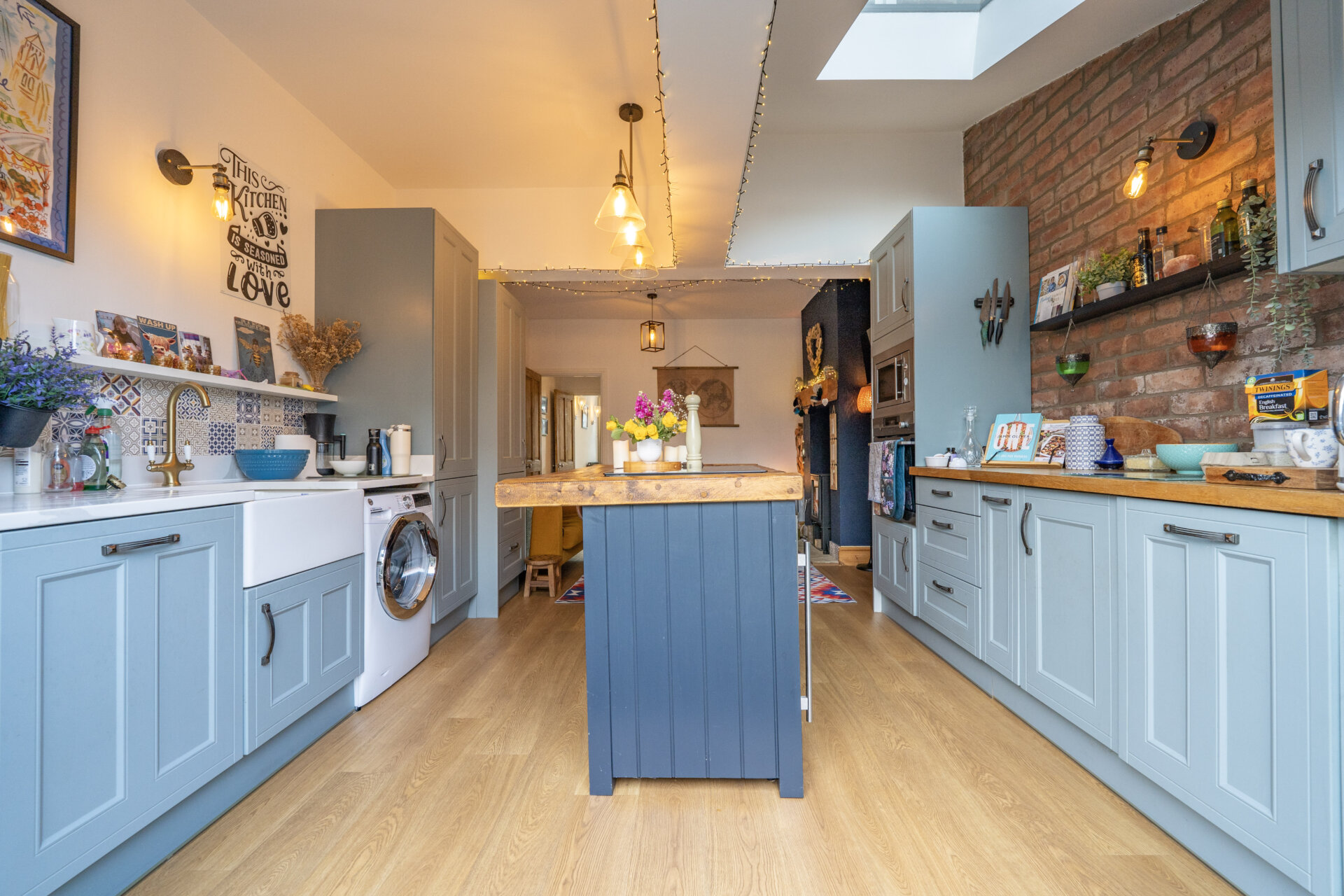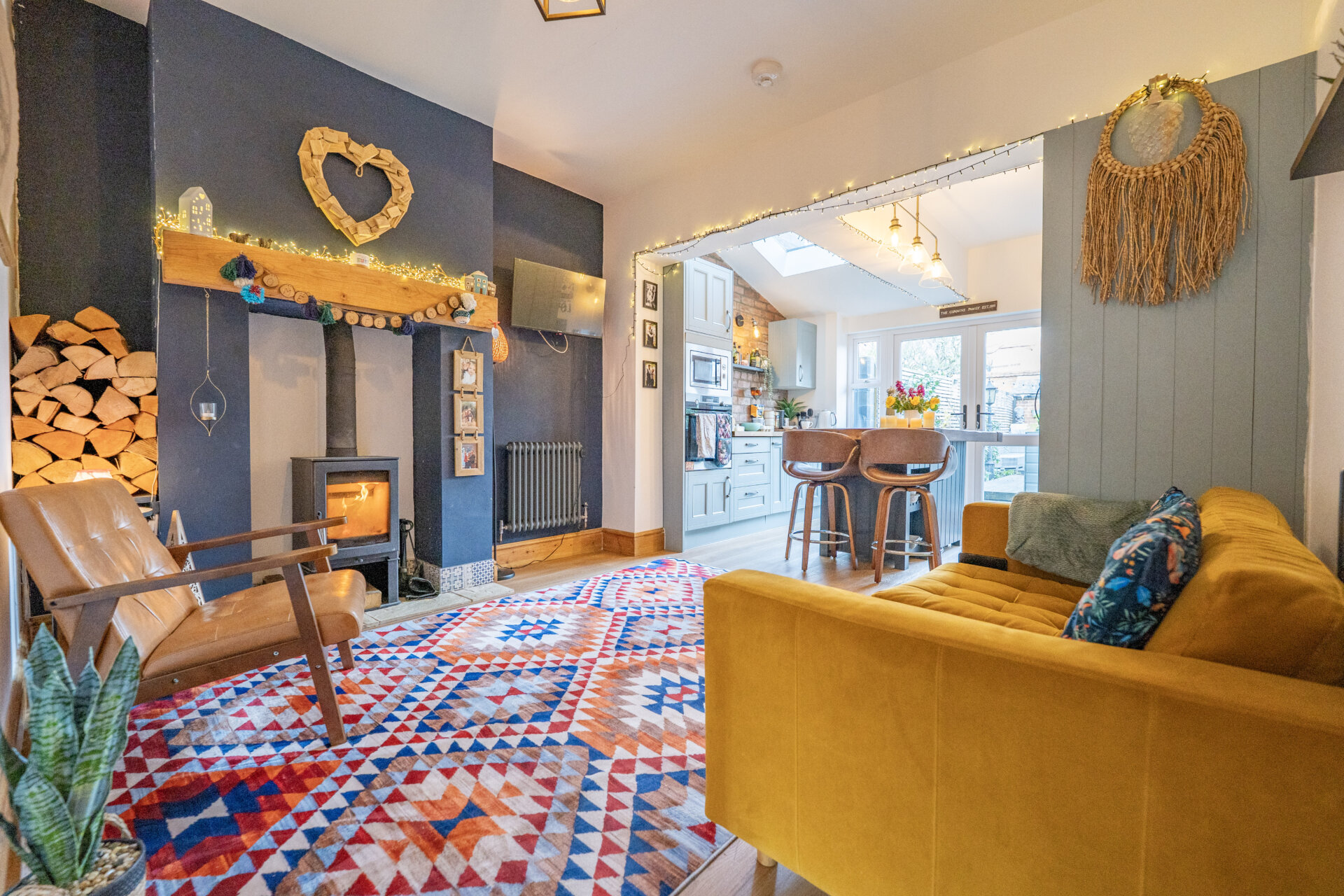 An extended room which is the main focal point of downstairs, the living area has a log burn on a tiled hearth, x2 radiators and a laminate floor. It is open to the kitchen which has wall, base and drawer units with work surface over, Belfast sink with a Gold mixer tap over, exposed brick wall, bin drawer, splashbacks, built-in fridge/freezer, dishwasher, eye level oven, microwave and plumbing for automatic washing machine. There is an island which has the Induction hob and additional storage, Velux window and French doors and windows facing onto the garden.