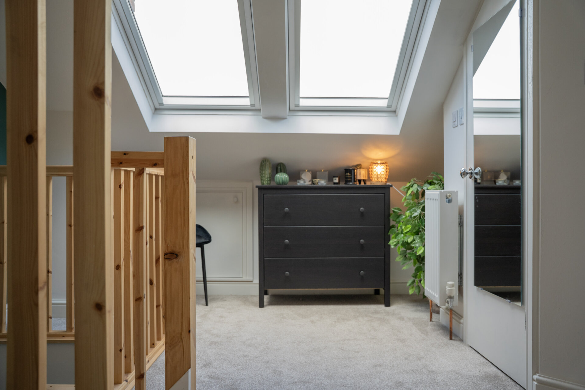 Spot lights, radiator, large storage cupboard, stairs to the second floor and doors to
