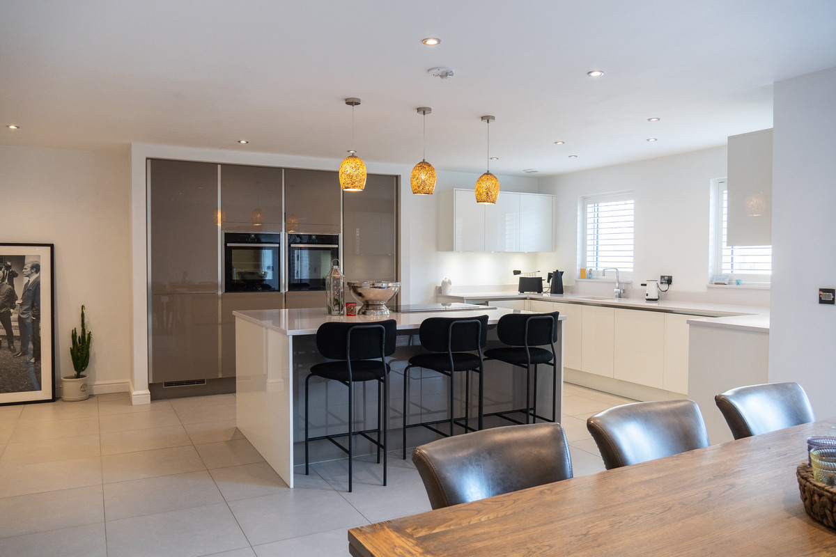 Expansive space to the rear of the home, this room really is the heart of the home with high quality fitted high-gloss units, integrated appliances including double oven and microwave and central island with high quality worksurfaces and inset Neff hob and rising extractor; bi-fold doors from this stunning room give access to the rear garden area.