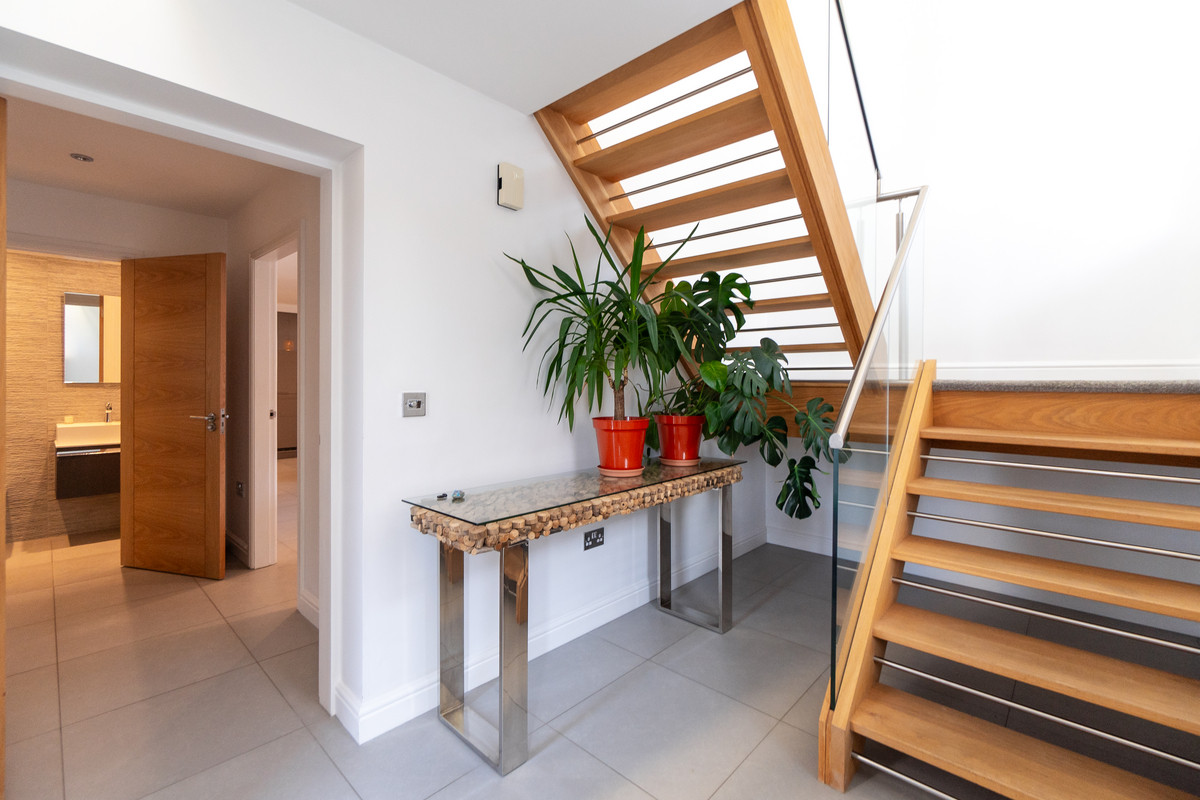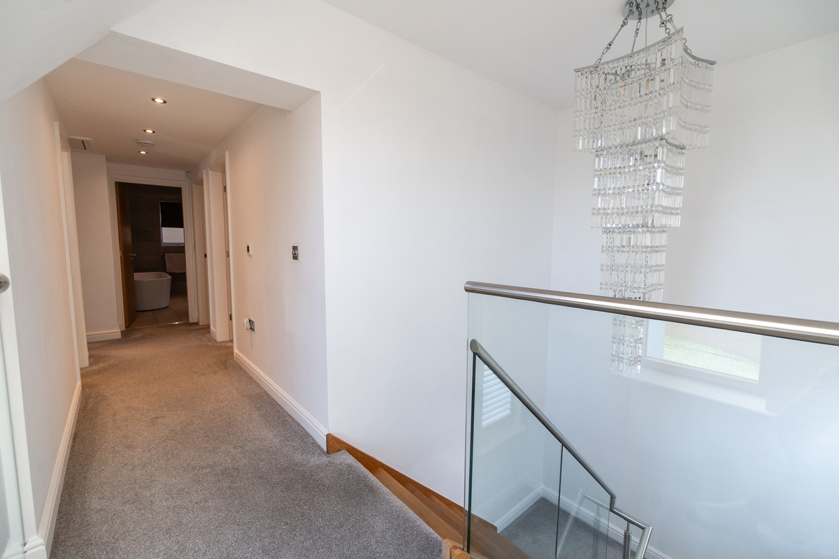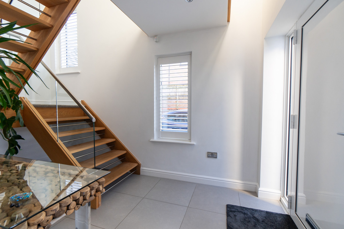 Accessed via the modern front entrance door. Having a feature oak and glass staircase, with glass chandelier fitted, leading to the first floor landing and benefits from under floor heating