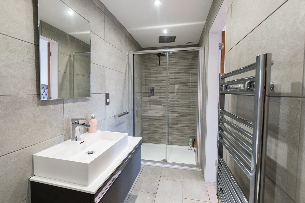Modern three piece en-suite with large shower and heated chrome towel rail.