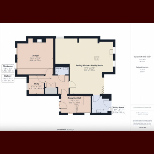 The property comprises of a spacious kitchen-diner spanning the rear of the property, two further spaces downstairs currently furnished as the formal living room and study, and completed with downstairs W/C and utility room.