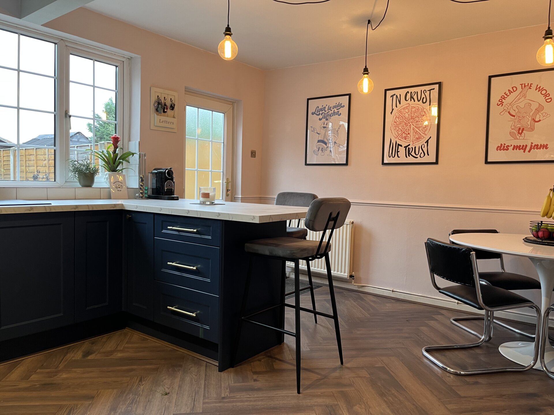 Navy blue wall, base and draw units with bronze handles and marble effect work tops, sink and drainer unit with swan mixer tap over, integrated oven, gas hob and extractor hood over, space for a dishwasher, plumbing for automatic washing machine, laminate floor, UPVC double glazed window and rear exit door, breakfast bar, telephone point and door to the under stairs storage.
