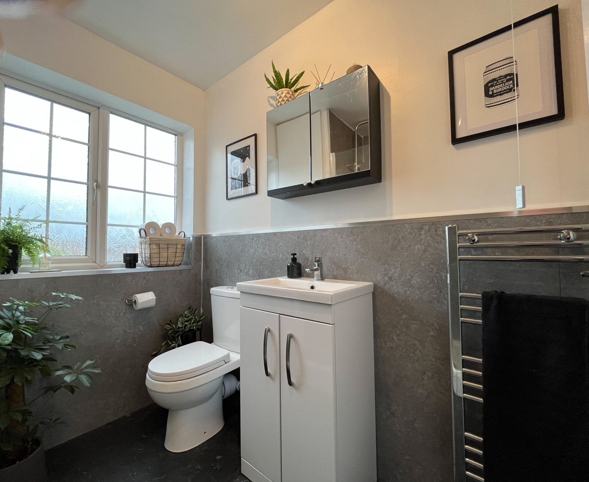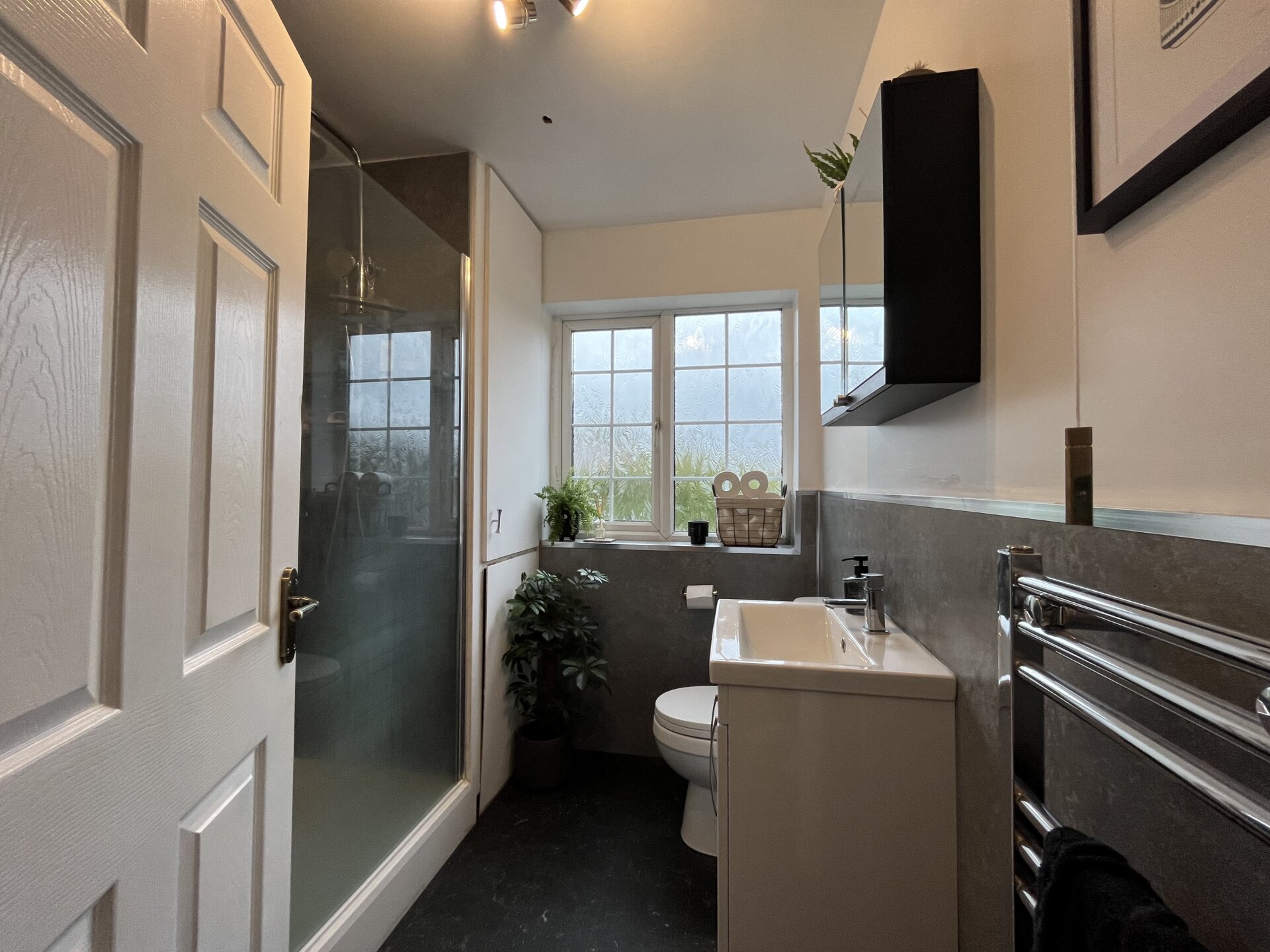 A large walk in shower cubicle with a shower from the mains, low flush w.c, sink with cupboard underneath, splashbacks, chrome heated towel rail, UPVC double glazed window to the rear and cupboard housing the gas central heating boiler.