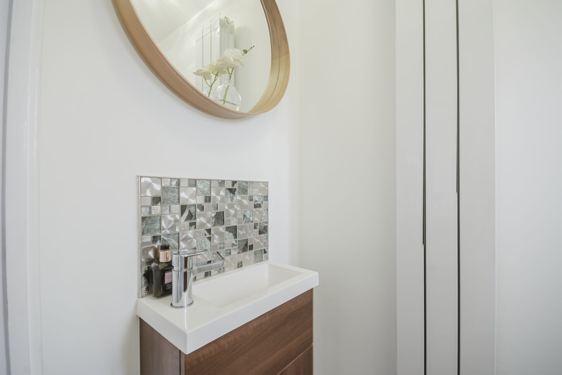 With opaque double glazed window to the front elevation, WC, vanity unit with wash hand Basin, tiled splashbacks, vertical modern radiator, vinyl flooring