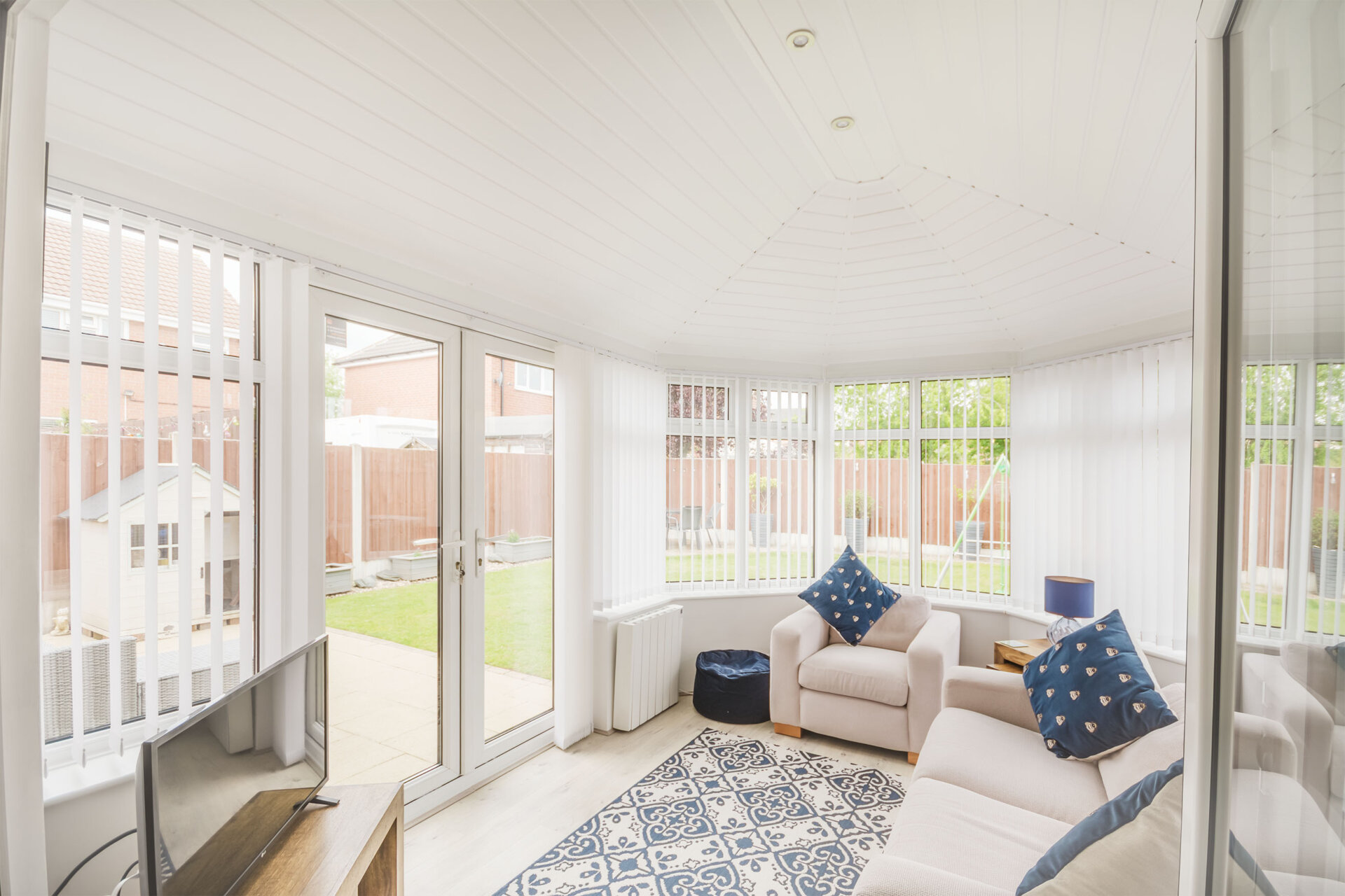 A fantastic extra reception room over looking the beautiful garden with double glazed window to three sides, double glazed patio doors, wall mounted radiator, spot down lights with thermal eco under cladding roof.