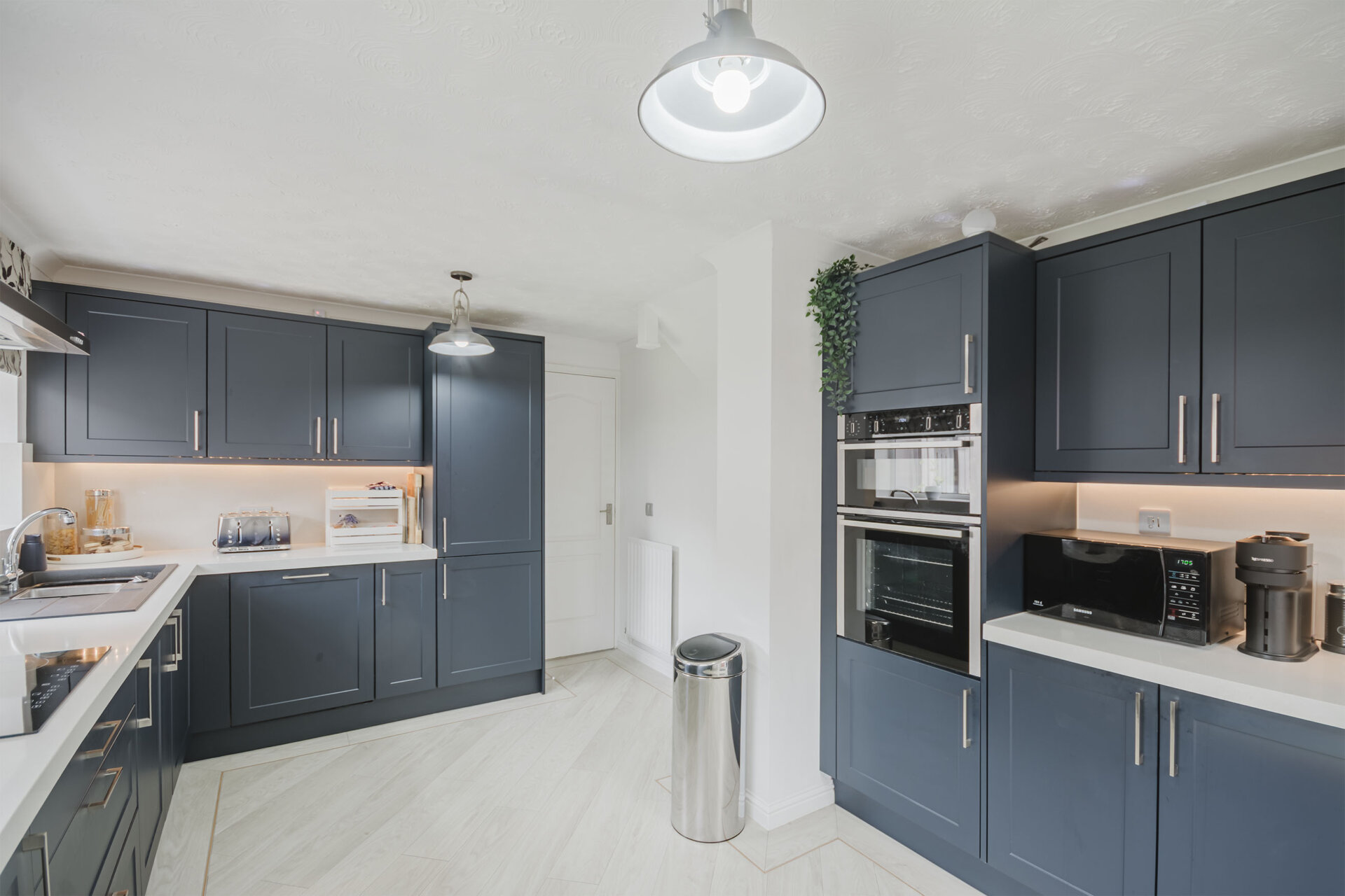 A refitted incredible kitchen with a range of wall and base units, quartz square top works surfaces, 1 1/2 bowl sink and drainer., with mixer tap, quartz splashbacks backs, integrated fridge freezer, dishwasher, standing height Neff oven and grill, space for washing machine, integrated bins, slow closing draws and pantry cupboards , 'Amtico' flooring, under stairs storage, two glazed windows to the rear elevation, induction Hobbs with extractor and , radiator, double glazed opaque door to the left elevation.
