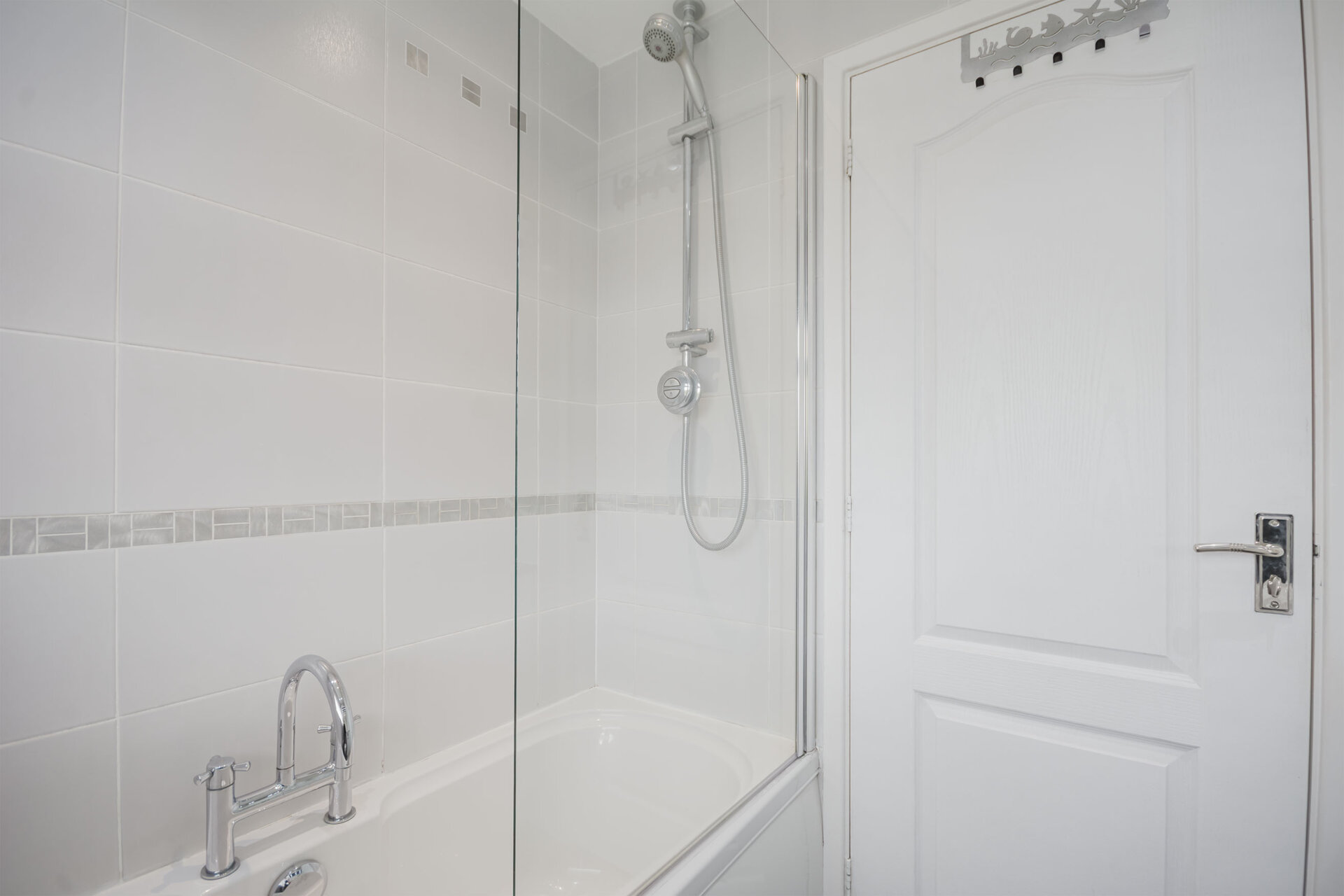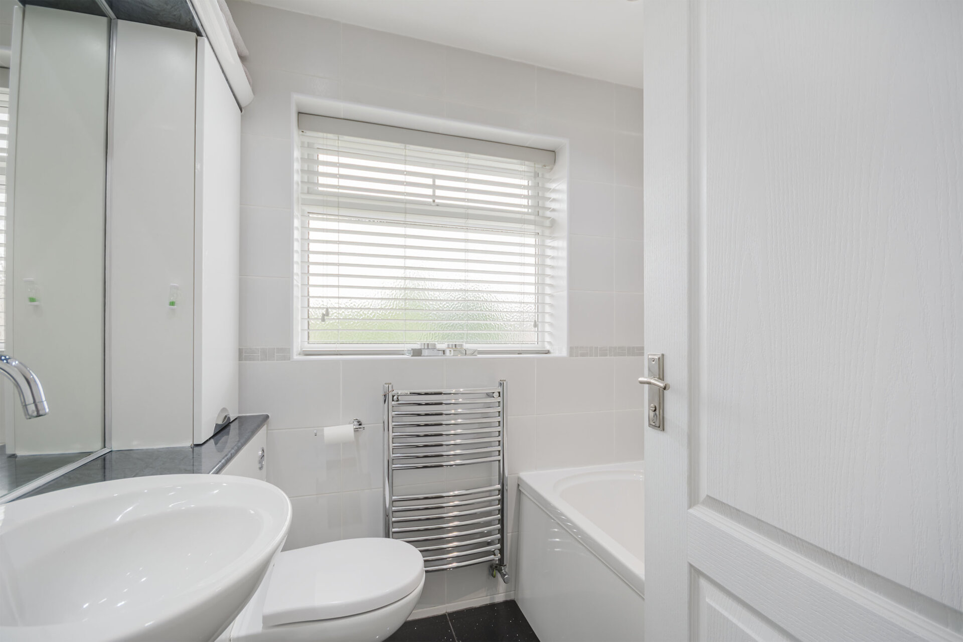 A white three-piece bathroom suite, Comprising Panelled bath, with shower over, mixer taps, glass privacy screen, tiled splashbacks, vanity unit with WC and wash hand-basin, ladder style radiator, opaque double glazed window to the rear.