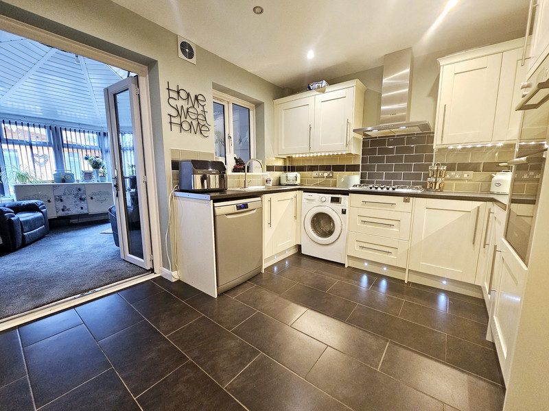 A modern refitted kitchen with a range of wall and base units, roll top work surfaces with tiled splash backs, sink and drainer with mixer tap over, space for washing machine and dishwasher, integrated standing height oven and grill, space for fridge freezer, under stair storage, tiled flooring, double glazed window to the rear and double glazed French doors to