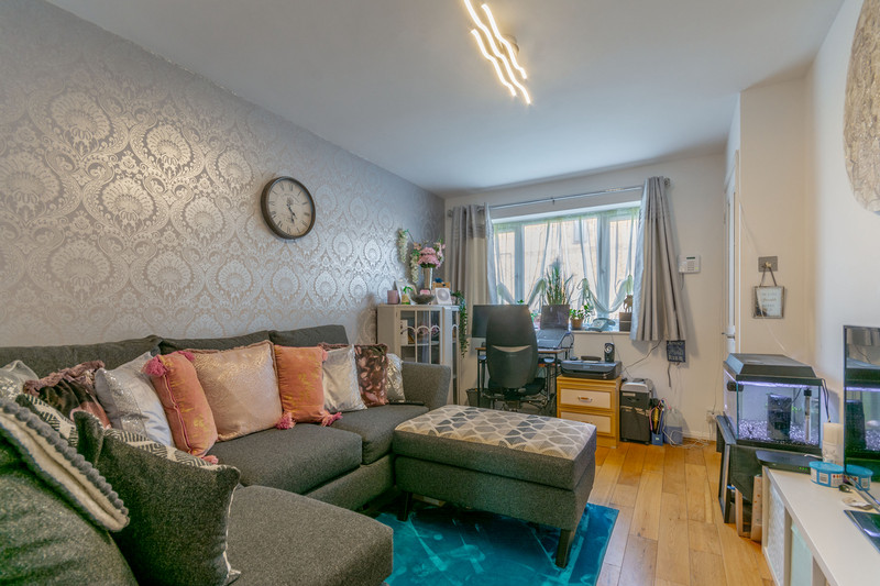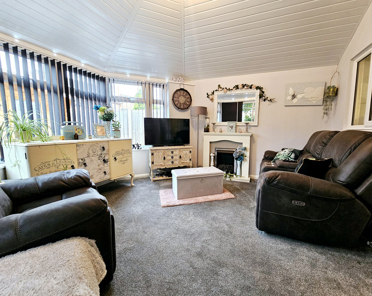 A beautiful room to enjoy the views over the back garden, this sitting room is both bright and spacious, with eco friendly roof and double glazed window to the rear and side elevation, carpet flooring, electric feature fire with surround and double glazed patio doors to the left.