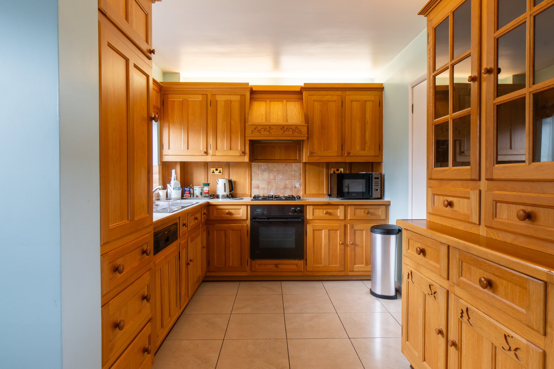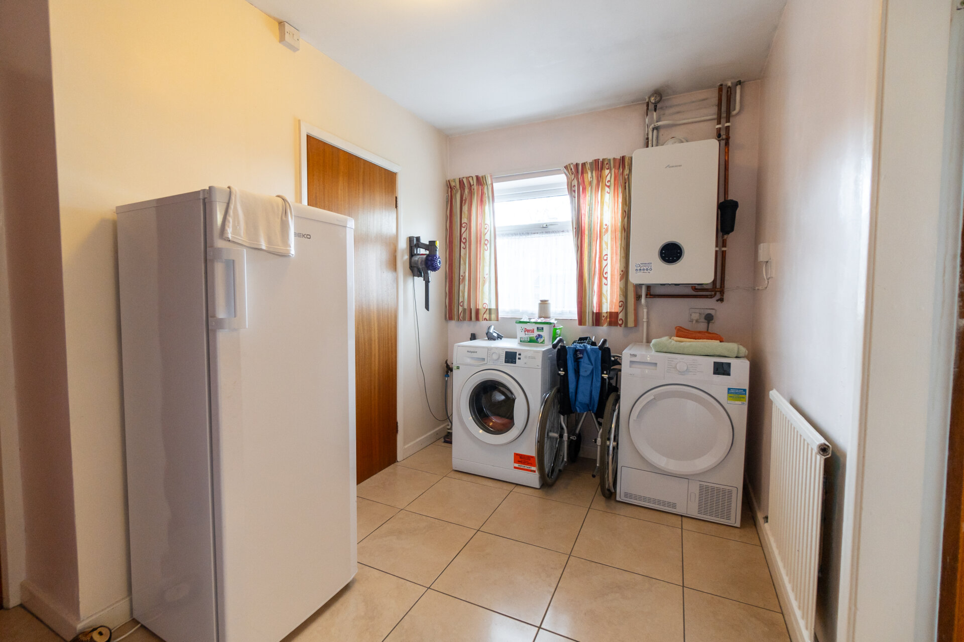 UPVC double glazed window to the rear, door to the front elevation, door to a large pantry, tiled floor, gas central heating boiler, door to the garage and door to