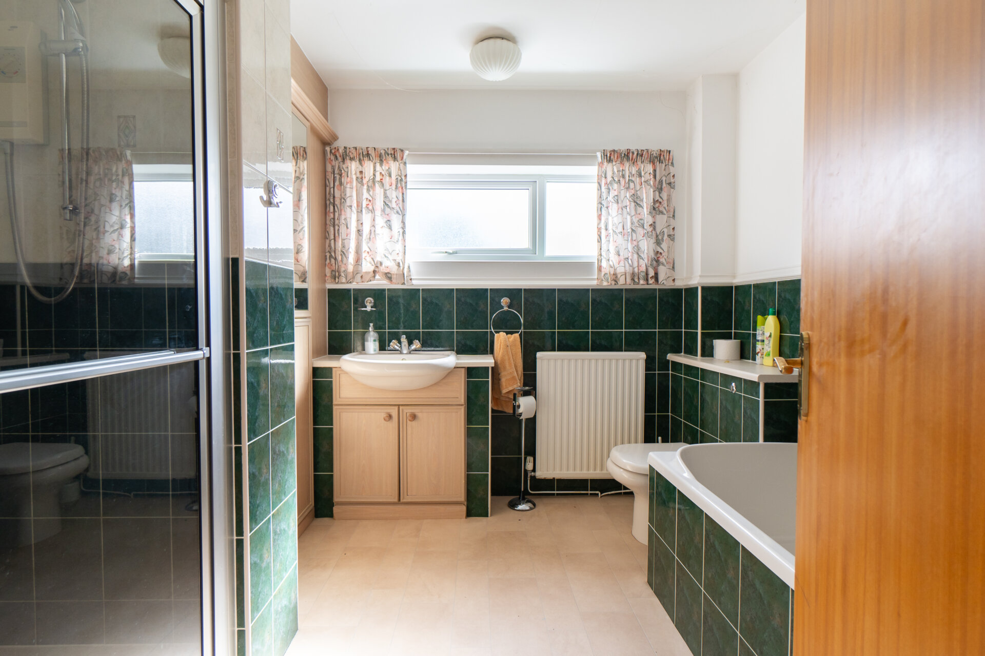 A four piece suite comprising a walk-in shower cubicle with shower from the mains, bath, low flush w.c, and sink with storage underneath, airing cupboard, tiled walls and splashbacks, UPVC double glazed window and radiator