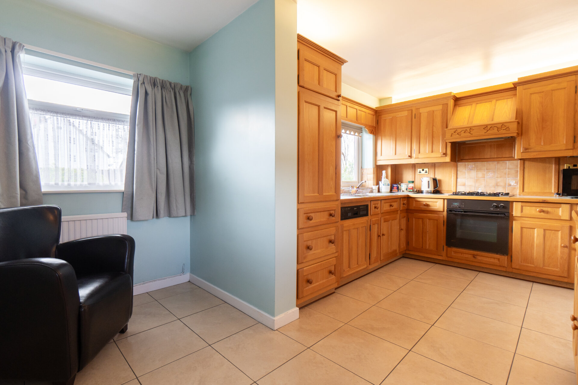 Wall, base and drawer units with work surface over, stainless sink, waste and drainer unit with mixer tap over, tiled walls and splashbacks, built-in fridge and dishwasher, built-in cooked, gas hob and extractor hood over, tiled floor, UPVC double glazed window x2 to the rear and one to the front elevation, x2 radiators and door to