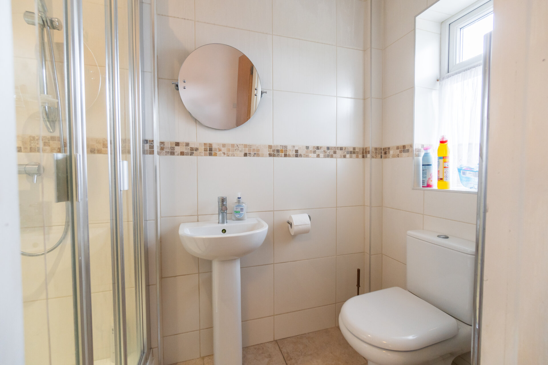 Walk-in shower cubicle with shower from the mains, low flush w.c, pedestal wash hand basin, fully tiled walls and splahbacks, tiled floor, chrome heated towel rail and UPVC double glazed window to the side