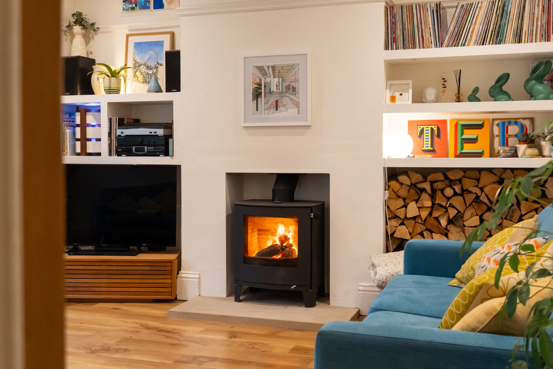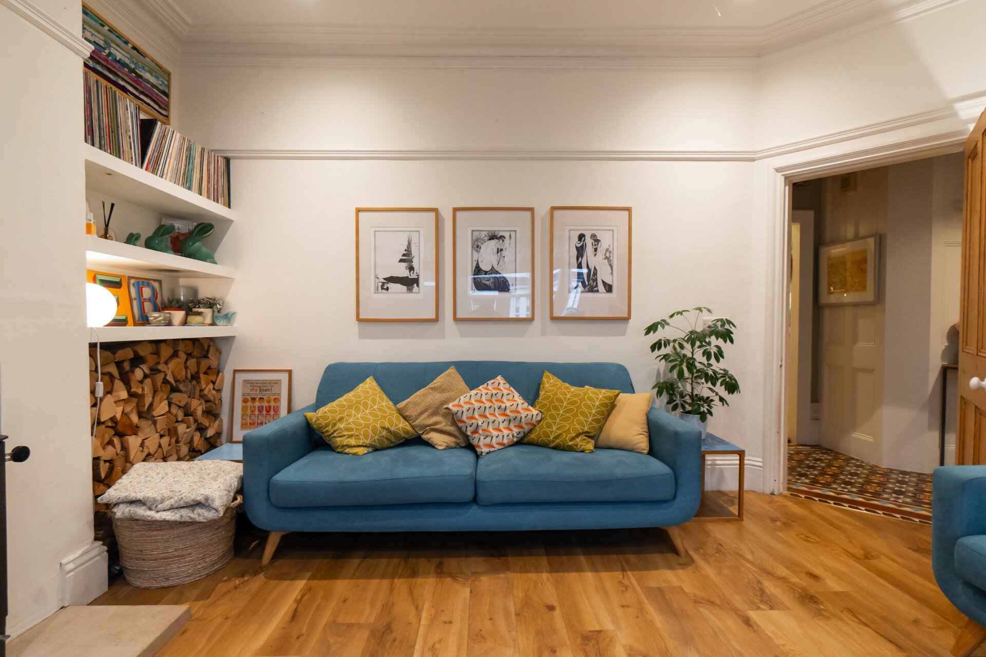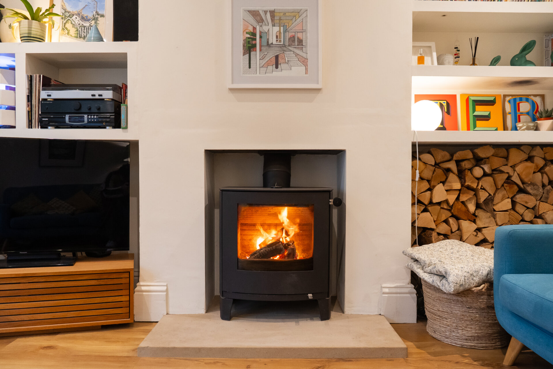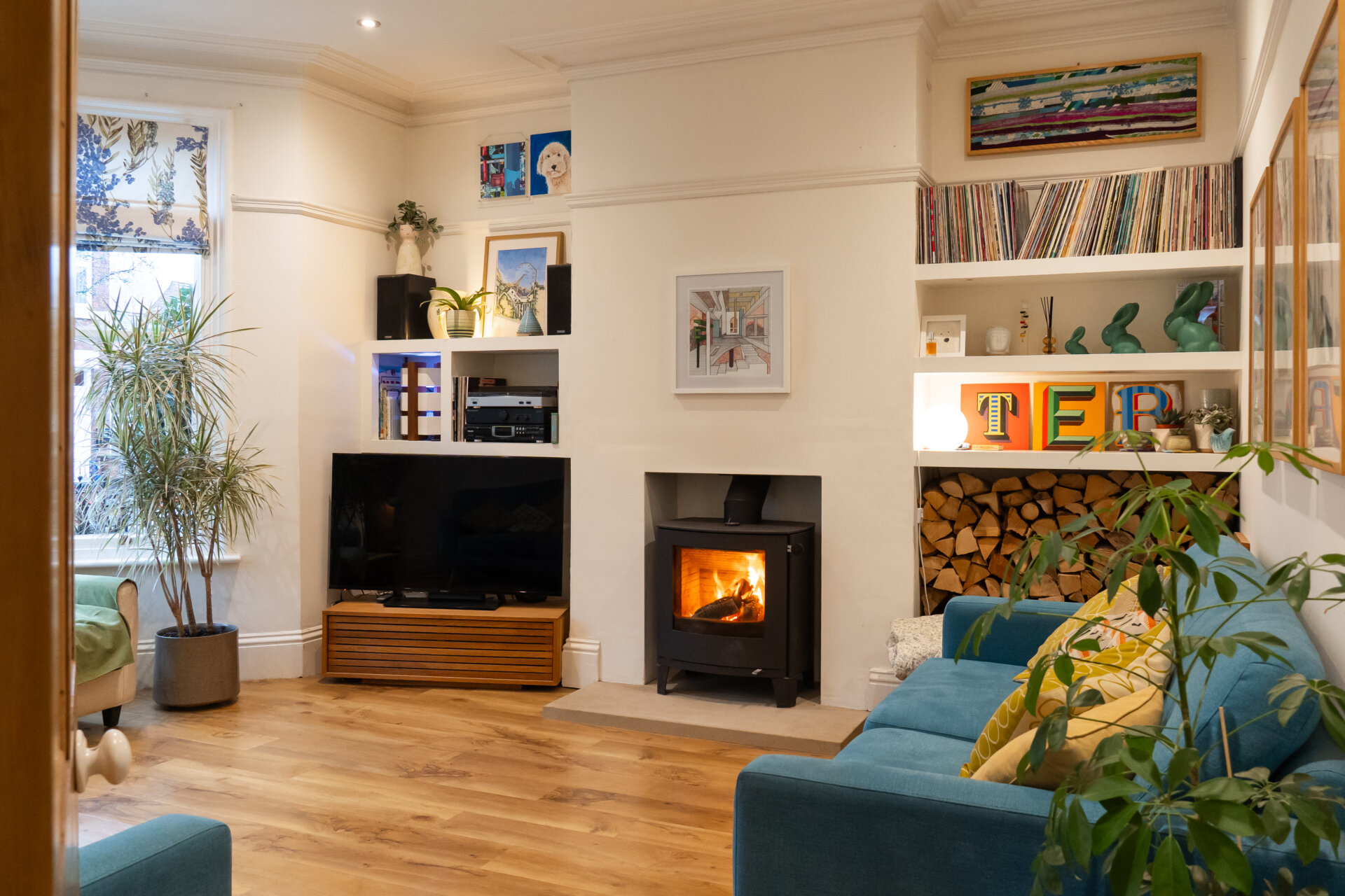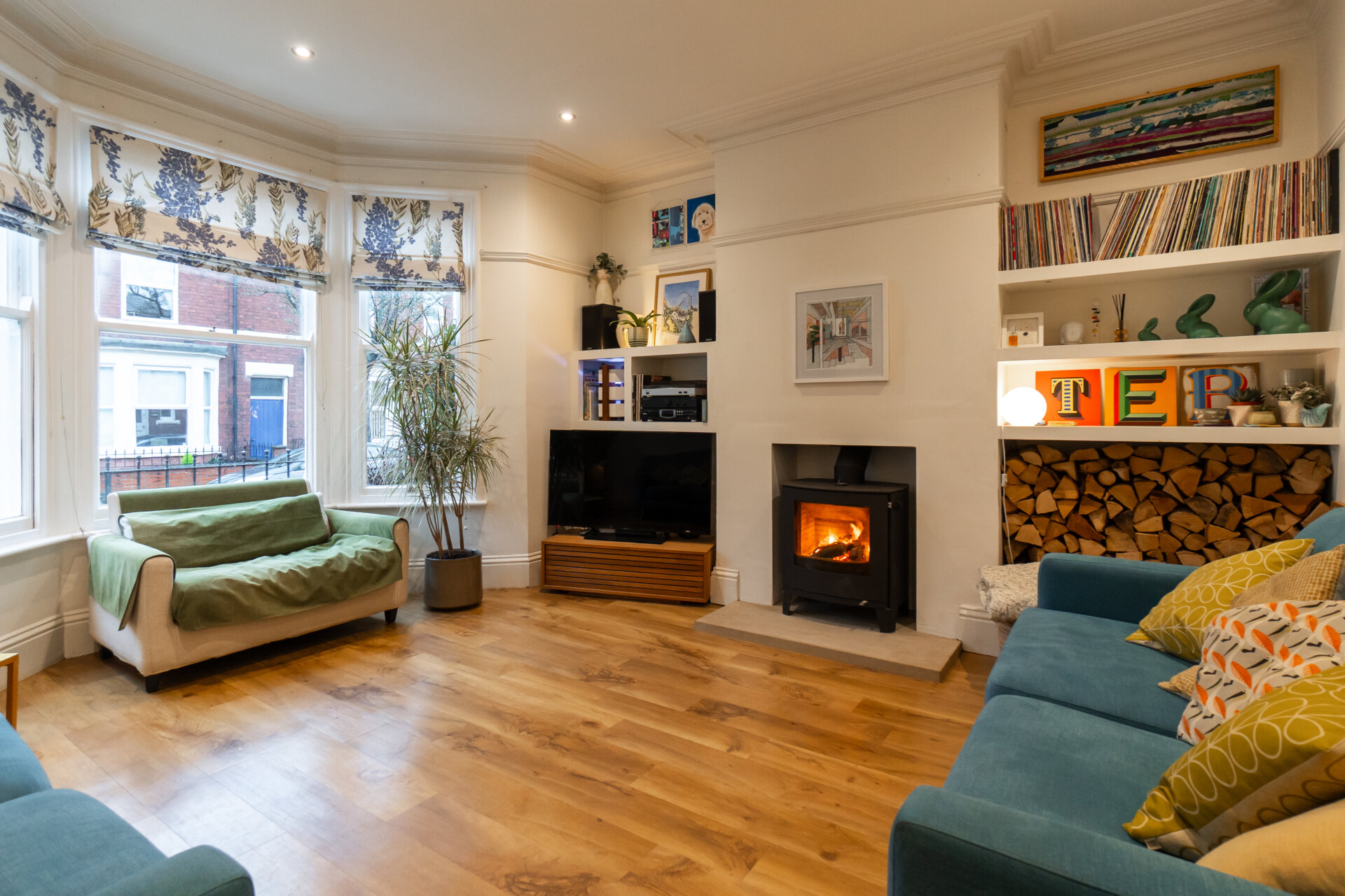 An elegant blend of modern comfort and period character, the lounge benefits from a walk-in bay window and high ceilings, enhanced by original period coving and a picture rail, allowing for excellent natural light and a sense of space. A log-burning stove set on a natural stone hearth provides a focal point, while sleek, modern floating shelving within the chimney recess to either side adds depth and practical storage. Additional features include inset ceiling spotlights with dimmable lighting, and both a standard and double radiator