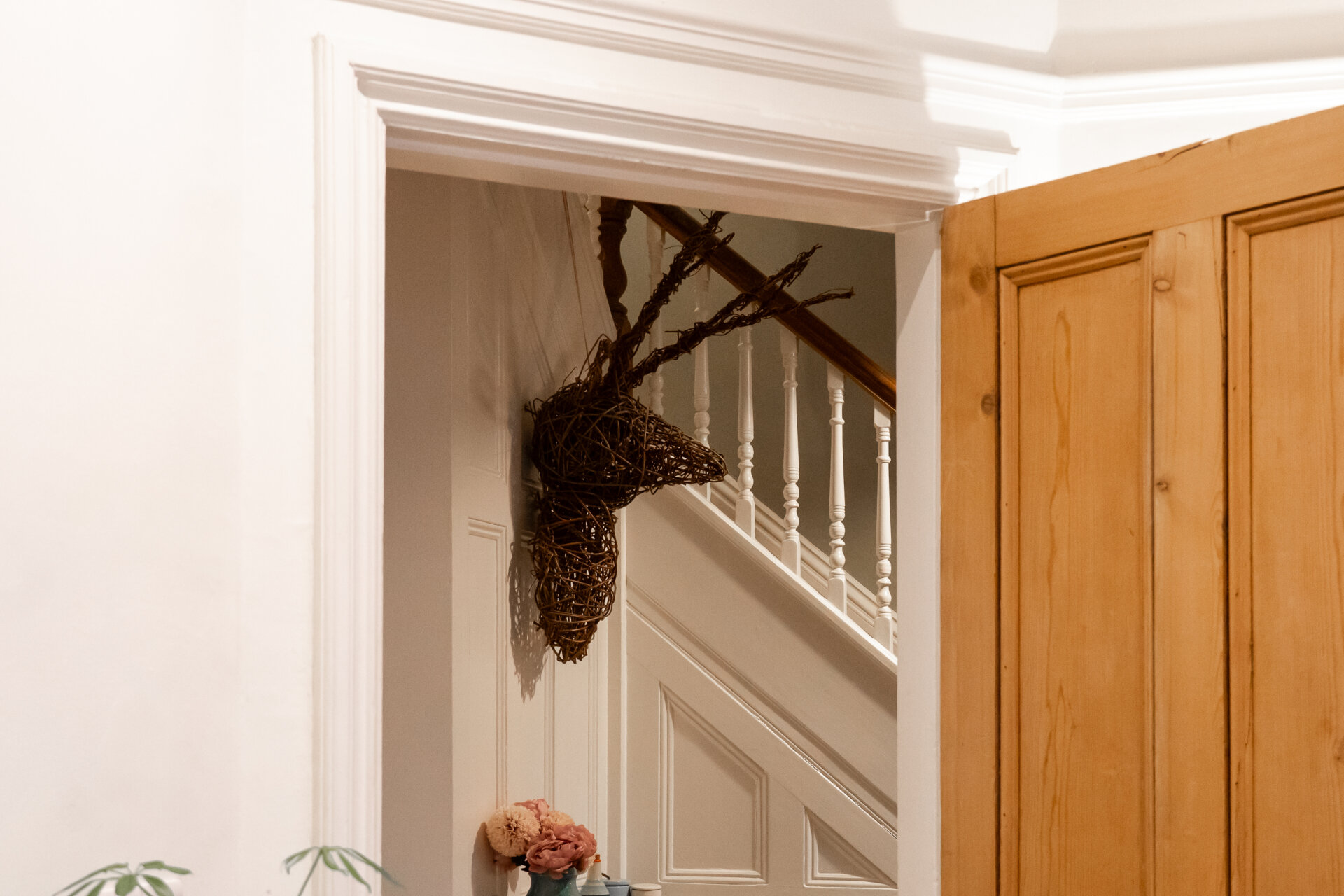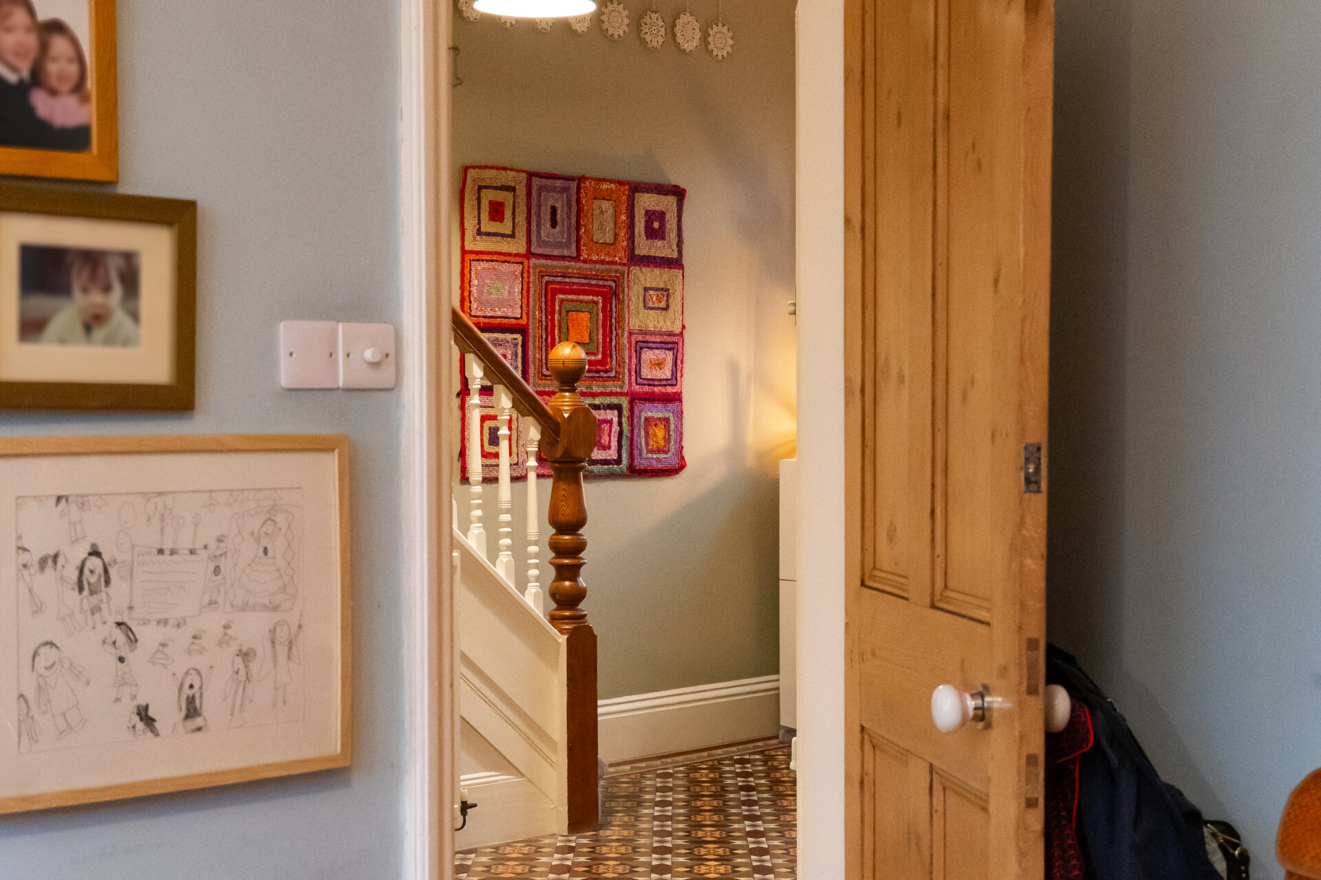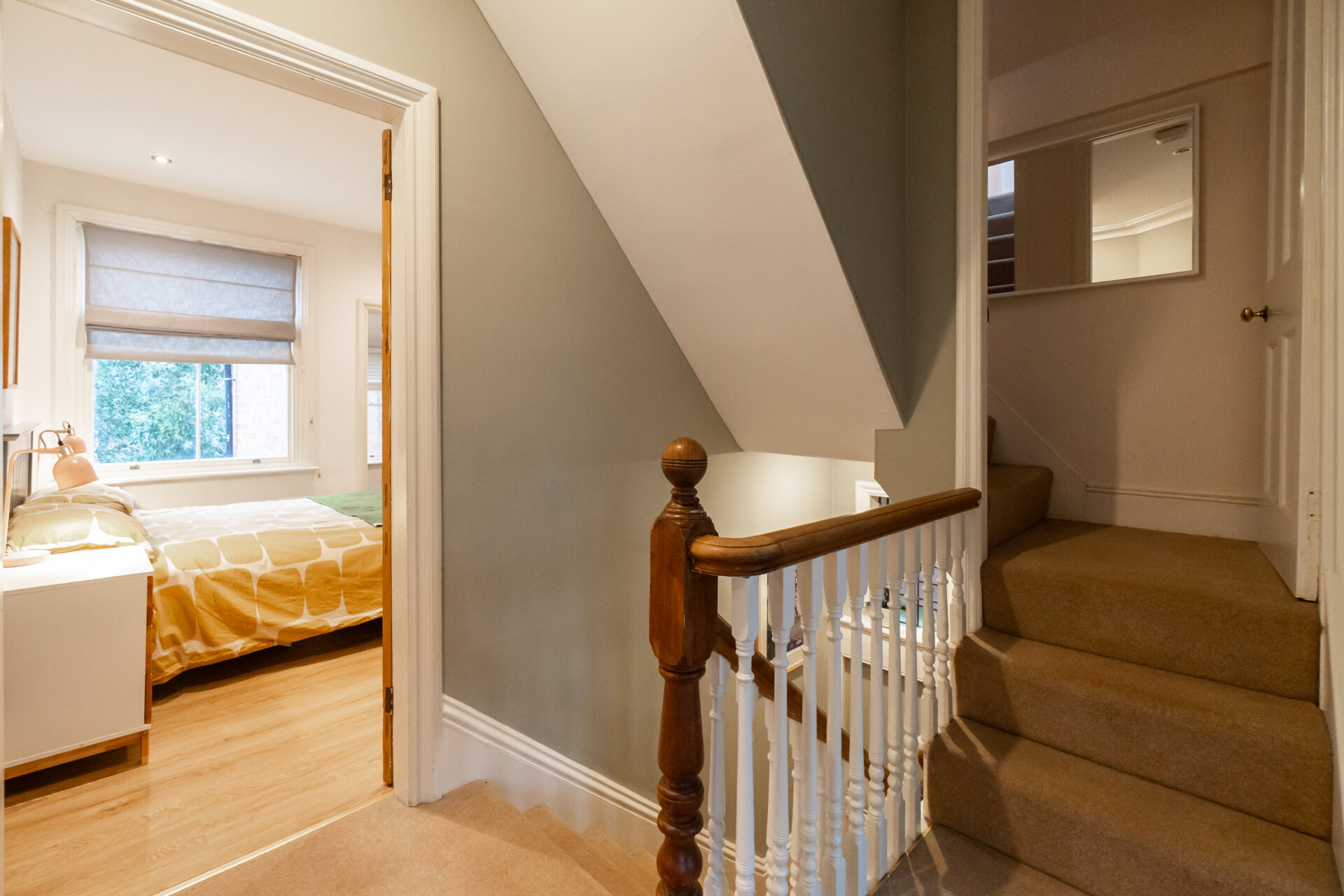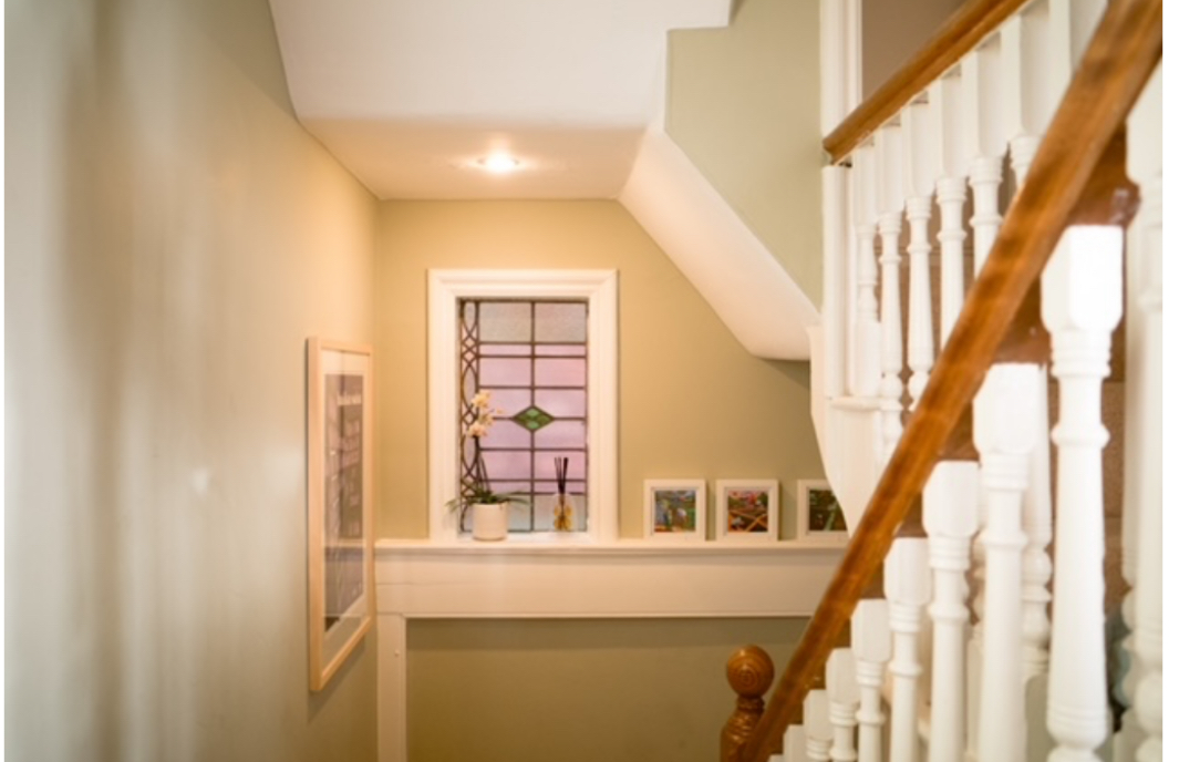 A lovely, spacious landing with period character and high ceilings, enhanced by natural light streaming through a stained-glass window at the halfway point of the staircase. The open balustrade design adds a sense of airiness, leading to three double bedrooms, the main family bathroom, and a private staircase up to the top-floor landing and fourth bedroom.