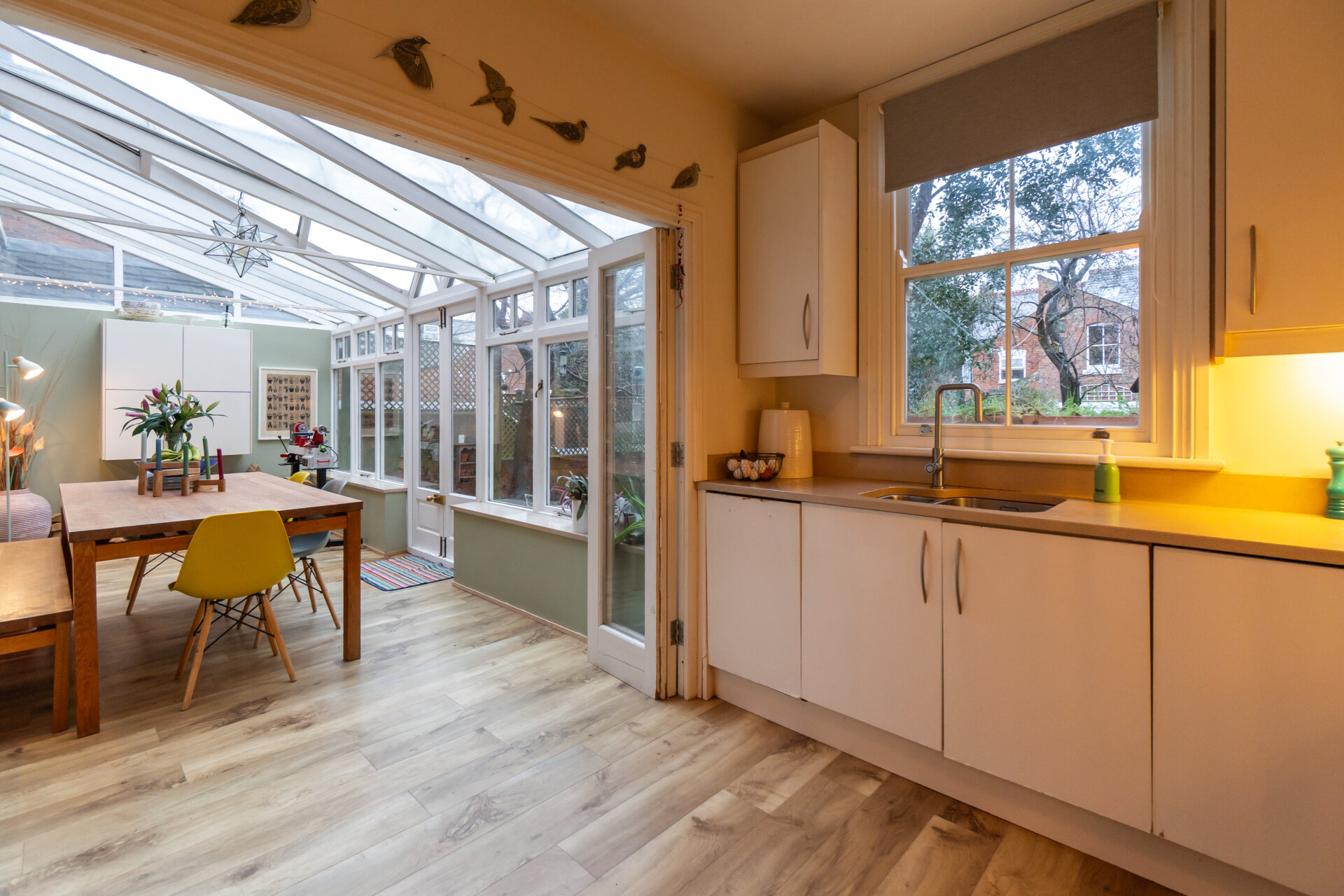 The true highlight of this kitchen is its seamless connection to the conservatory via cleverly designed bi-folding internal wooden and glazed doors, creating a striking, elegant feature. This open-plan arrangement provides an exceptional space for entertaining or family dining, combining practicality with visual appeal.