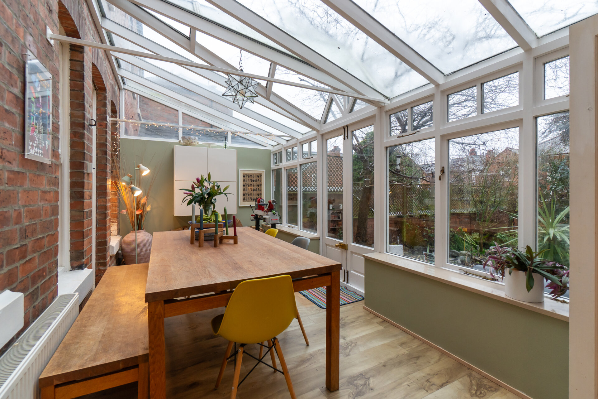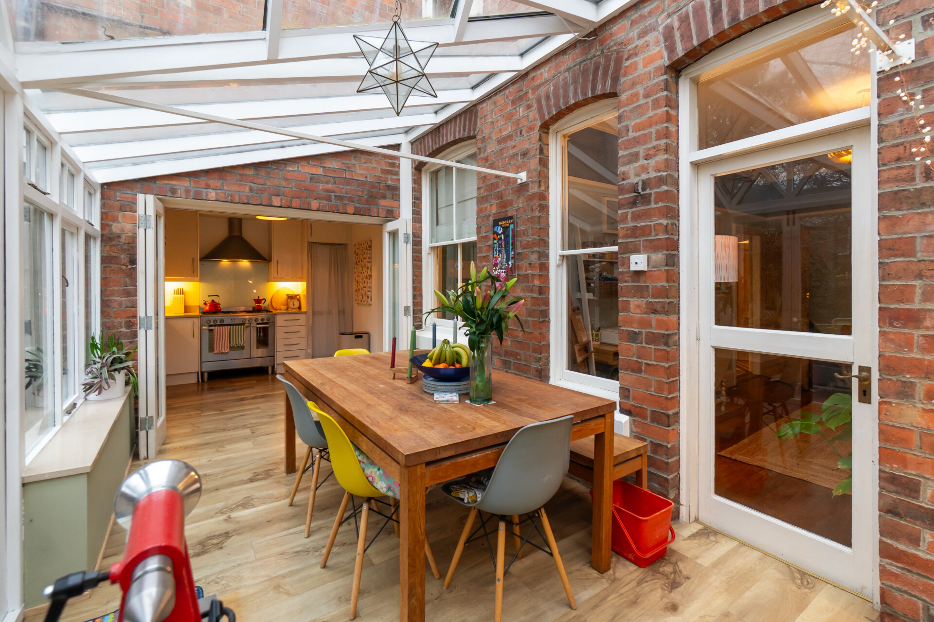 The double-glazed wooden conservatory extends across the rear of the property, thoughtfully linking both the dining room and kitchen. Showcasing the open brick façade of the house, it retains a period charm with antique brass fittings and dimmable lighting, creating a room full of character and visual interest. The space features a double radiator, tiled flooring, and double doors opening directly onto the garden, with ample room for a table or occasional seating. Bi-folding internal wooden and glazed doors connect seamlessly to the kitchen and breakfast room, providing a versatile, light-filled space ideal for entertaining or relaxed family use.