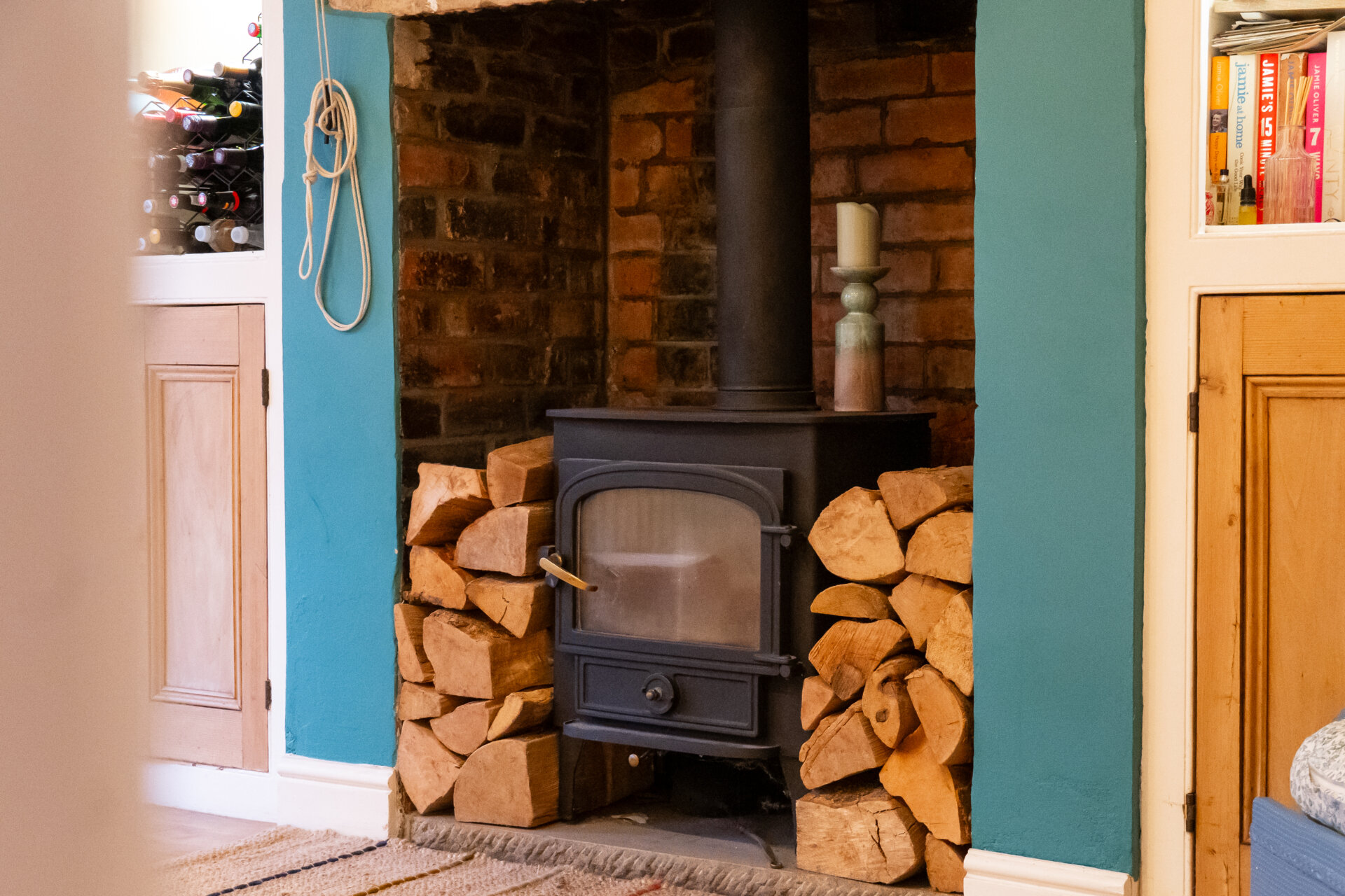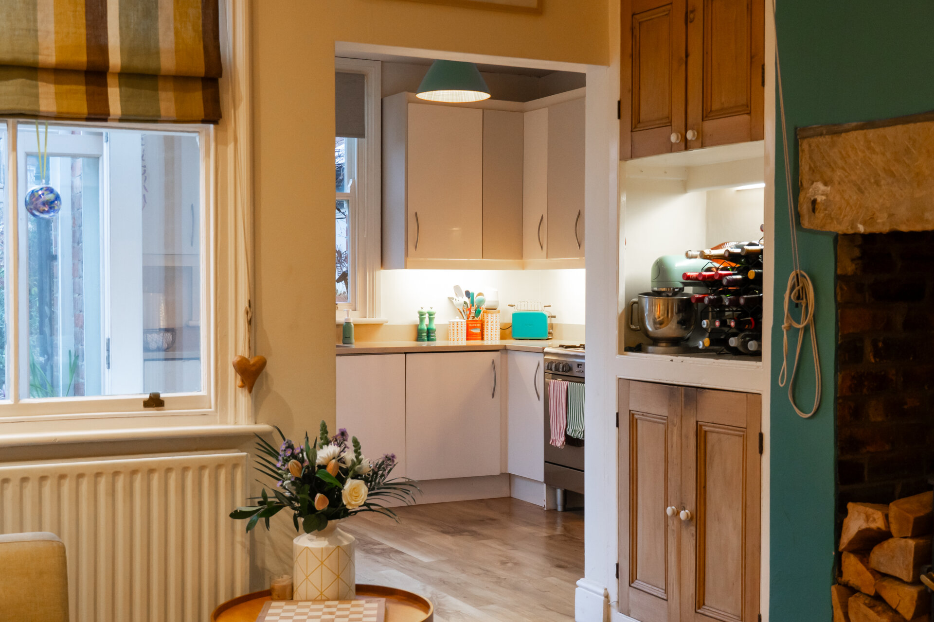 A third reception room accessed directly from the entrance hallway, this attractive breakfast room features a log burner as its focal point, set beneath an exposed lintel with exposed internal brickwork adding further character. The chimney recess has been thoughtfully fitted with shaker-style timber storage cupboards, in keeping with the period of the property and providing practical storage. An internal sash window offers views through to the conservatory, while an open aspect draws the eye through to the kitchen at the rear of the house. An internal door also provides access to the generously proportioned cellar.