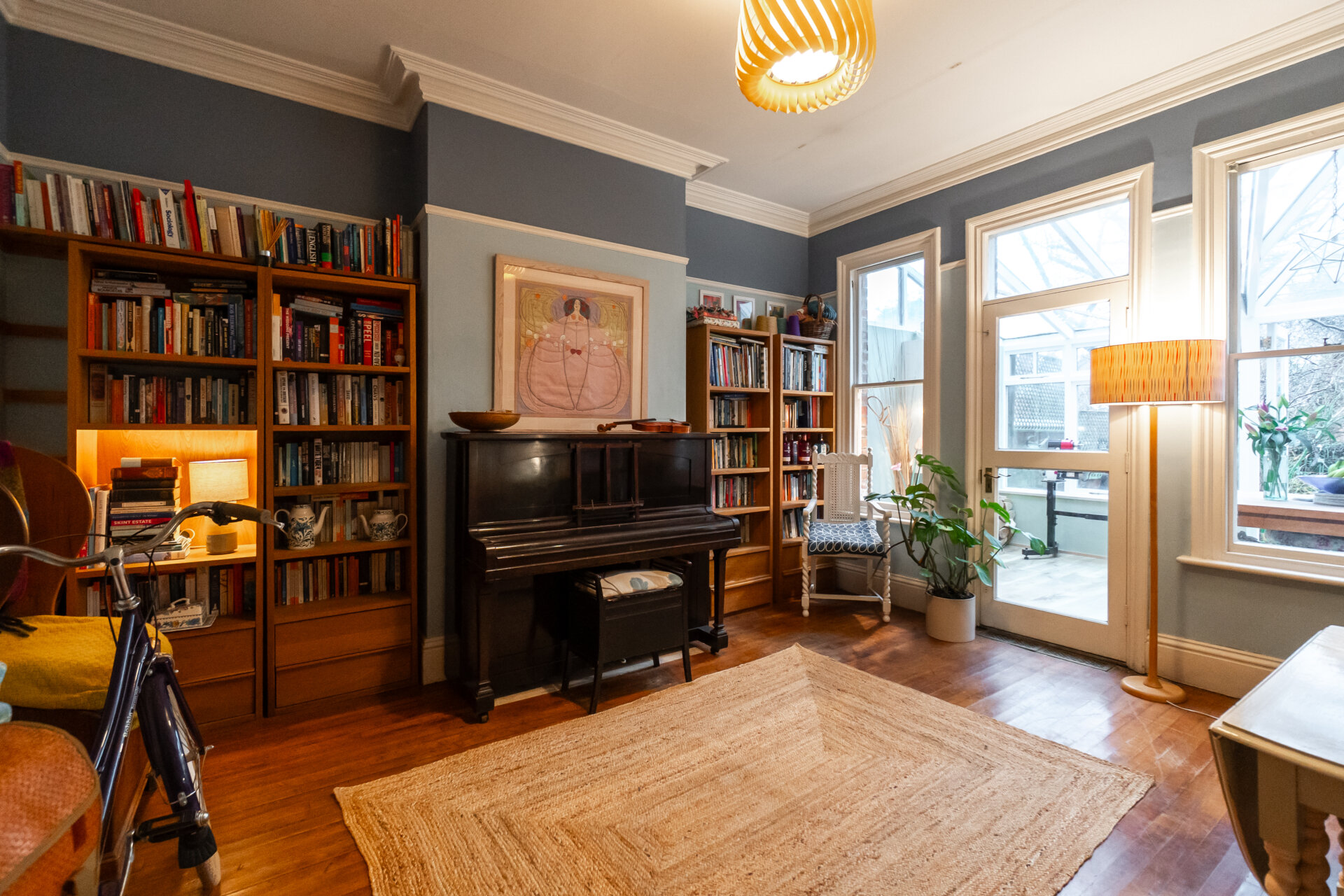 A generous dining room boasting reclaimed wood strip-laid parquet flooring, this attractive space is currently used as a music and creative room. The room is filled with natural light via an internal glazed wooden door leading to the conservatory, flanked by two period sash windows. Versatile in use, the room also benefits from high ceilings, decorative coving, and a radiator,