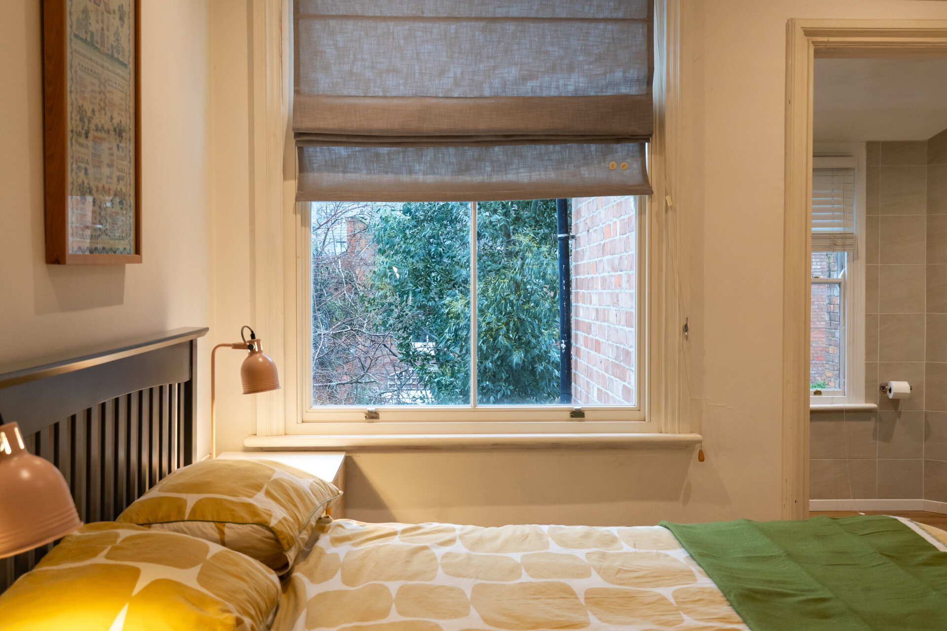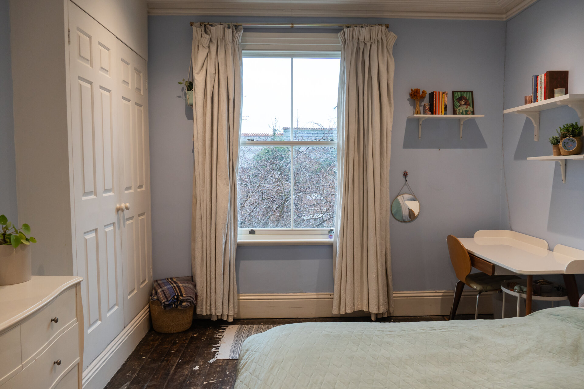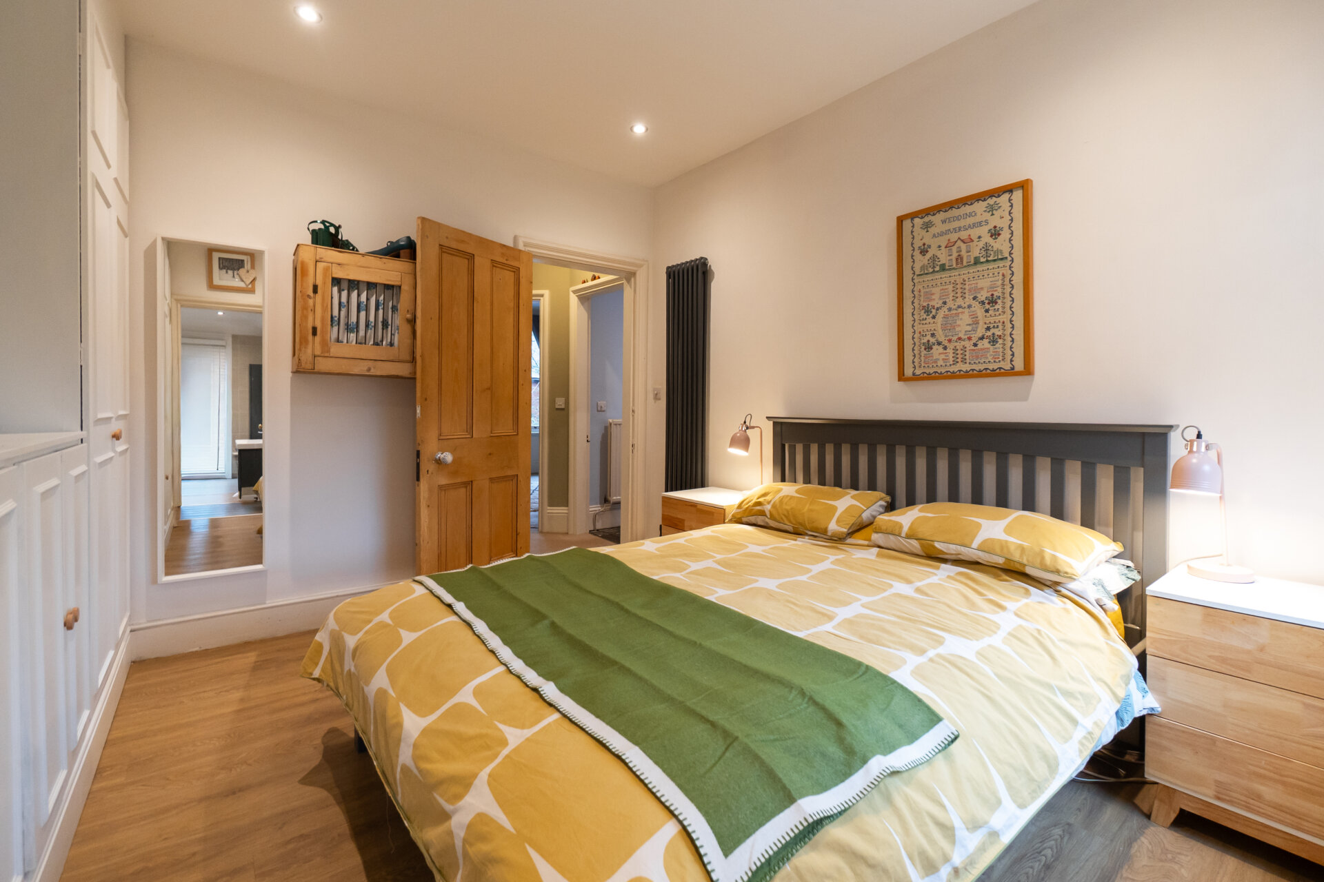 Another generous double bedroom, this elegant room features fitted double wardrobes within the chimney recess, a radiator, period sash windows overlooking the garden, a restored London-style timber internal door, and exposed wooden flooring.