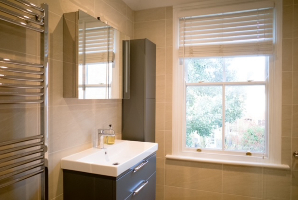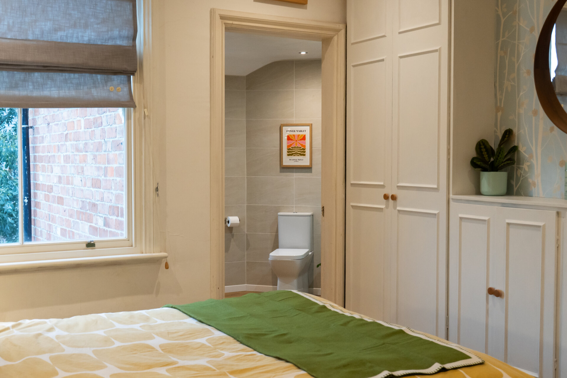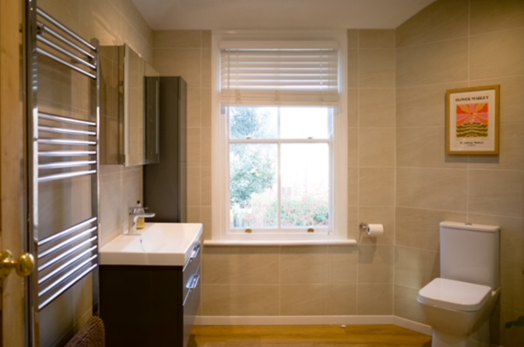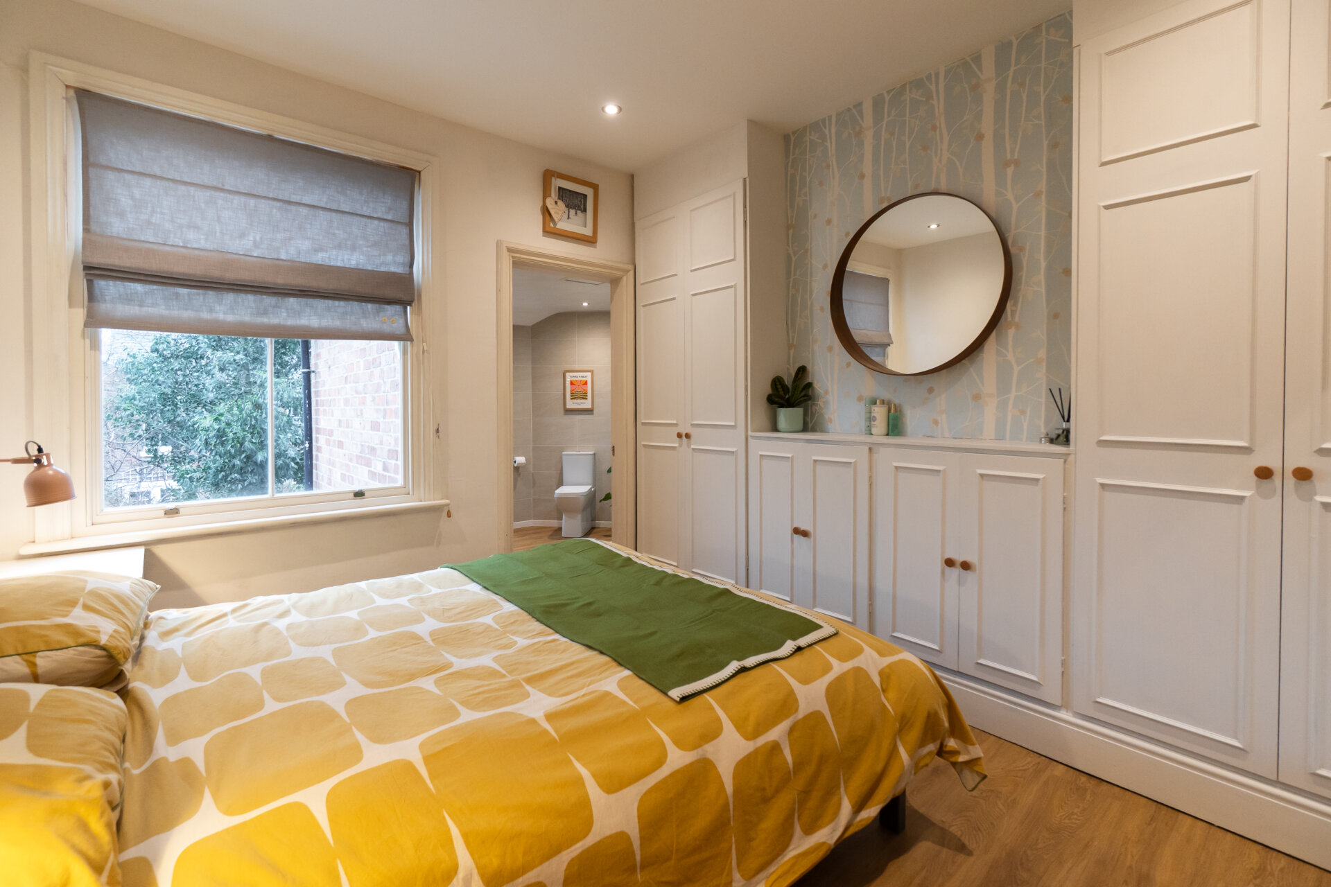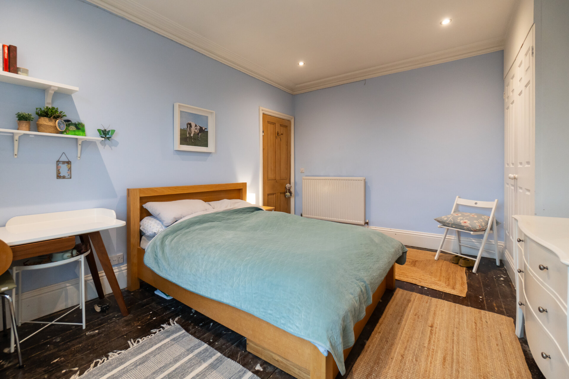 This double room has been chosen as the master, not for its size, but for its luxury ensuite and double fitted wardrobes with additional low-level storage. Positioned to the rear elevation of the property, the room combines modern elegance with period charm, featuring an anthracite vertical column radiator, inset spotlights, a period sash window, and restored London-style internal doors. The result is a fresh, stylish, and comfortable retreat.