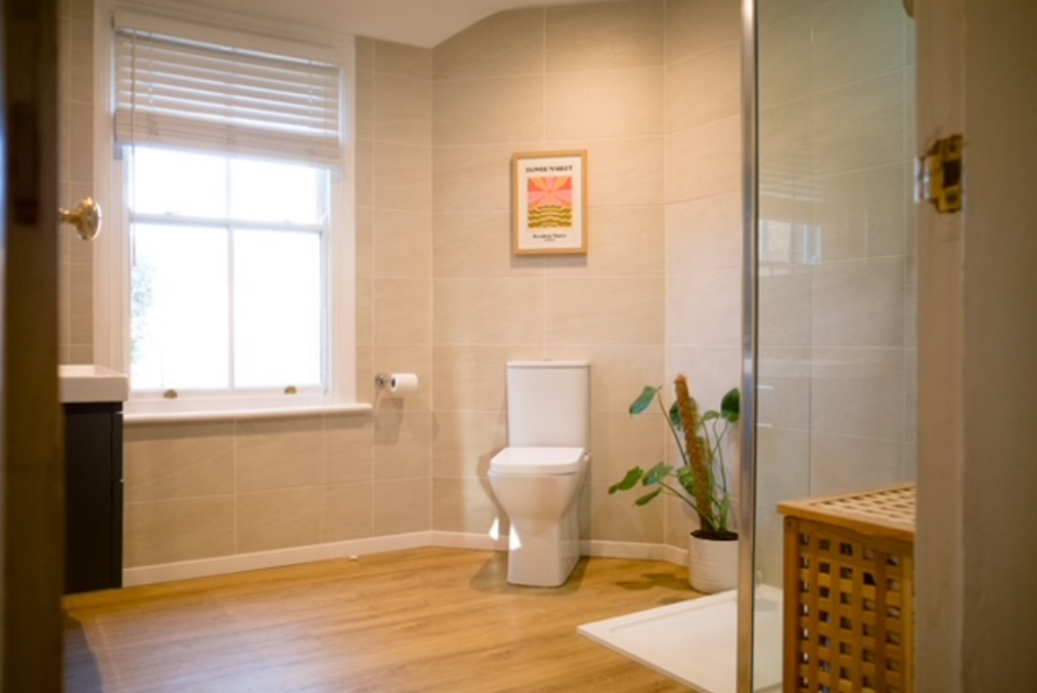 A large, stylish en-suite, fully tiled throughout, featuring a low-profile composite double shower tray with a walk-in shower and glazed screen, including an additional pivoting panel for extra glazing, and a chrome thermostatic shower with both fixed and movable heads. The room also includes a low-level WC and a modern floating vanity unit with drawers, topped with a double-sized wash hand basin. Above, a mirrored storage unit is complemented by a matching side storage unit, while a chrome heated towel radiator adds both practicality and sleek design. A timber sash window to the rear elevation provides natural light, and the space is completed with an extractor and inset spotlights, combining contemporary style with functional elegance.