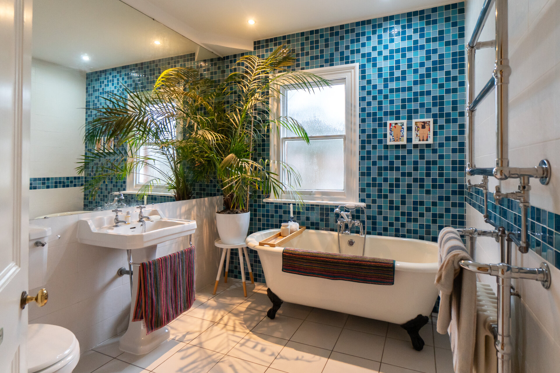 A beautifully appointed, fully tiled bathroom, featuring a striking cast-iron, double-ended ball-and-claw bath with chrome Victorian Berisham 1855 mixer taps and hand-held shower attachment. The room also includes a traditional pedestal wash hand basin with matching Victorian-style 1855 chrome taps, a low-level Victorian-style WC, and a mirrored storage unit. A pair of double Victorian column-style towel radiators in chrome and cream add both elegance and practicality. A period sash window with obscured glass provides privacy while admitting natural light, and inset spotlights alongside a generously proportioned fitted mirror complete this refined and characterful bathroom, seamlessly blending period charm with modern comfort.