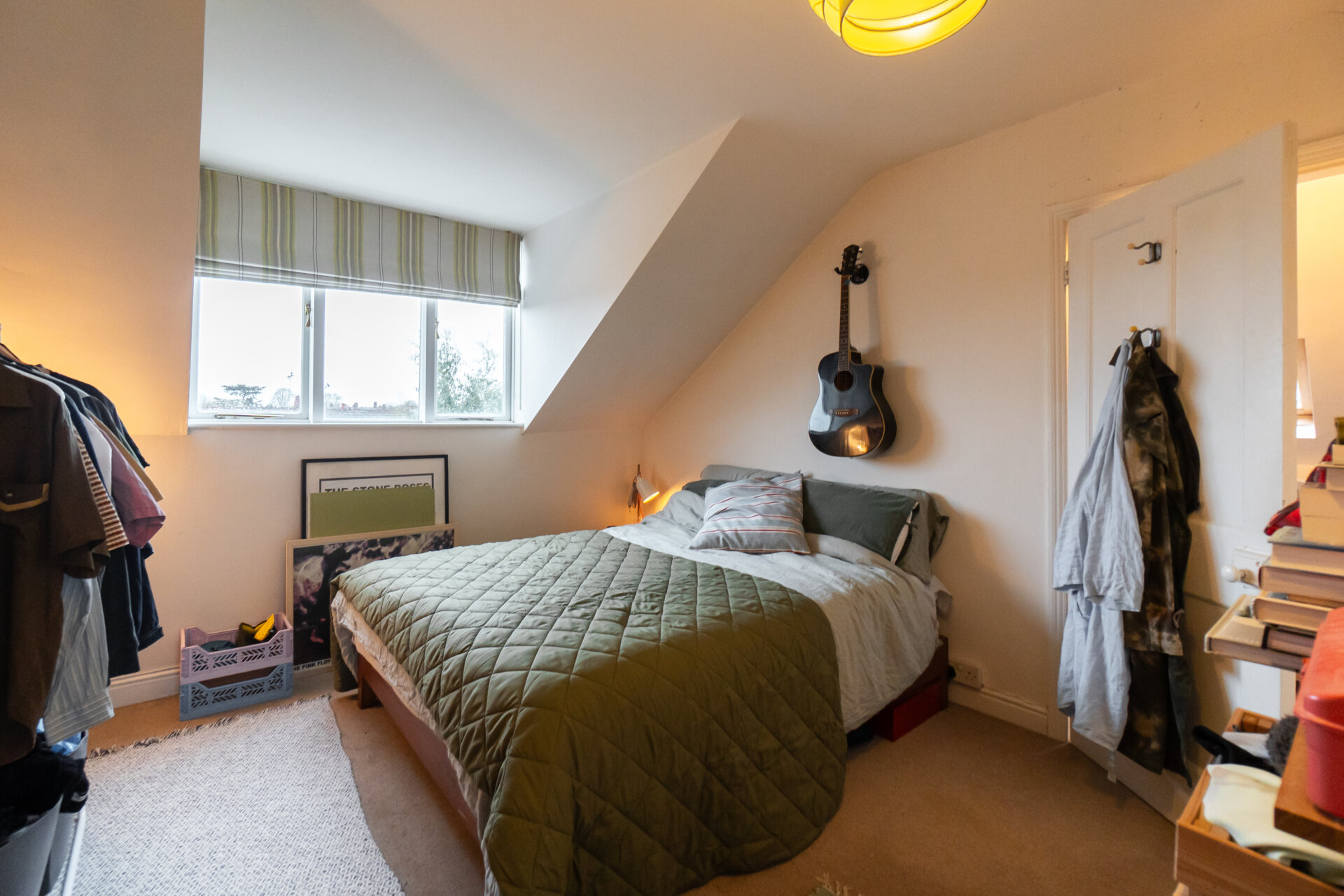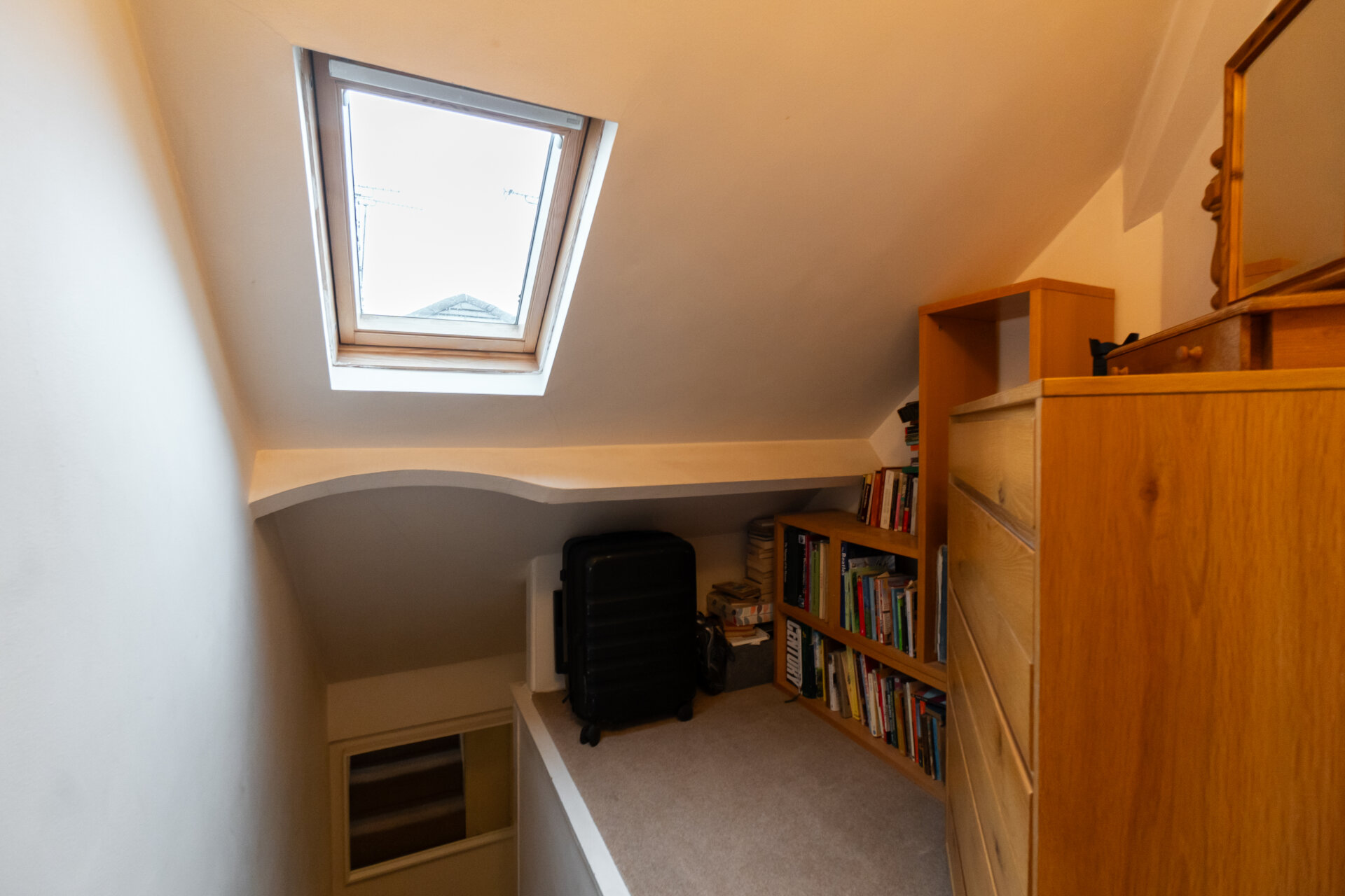 A private top-floor landing, featuring a Velux window providing natural light and open space for storage, with an internal door giving access to the fourth bedroom.