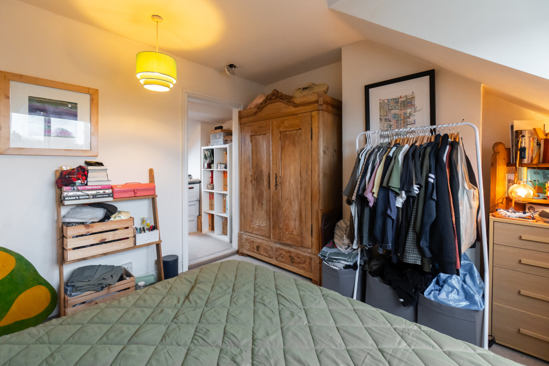 Accessed via a private landing, this double bedroom features a timber dormer window to the rear elevation, offering rooftop views. It provides access to a secondary through room, currently used for storage but with the potential to serve as a dressing room, nursery, or office (4.62 x 2.43 m). This adjoining space includes two eaves storage areas and a Velux roof window, with varying ceiling heights.