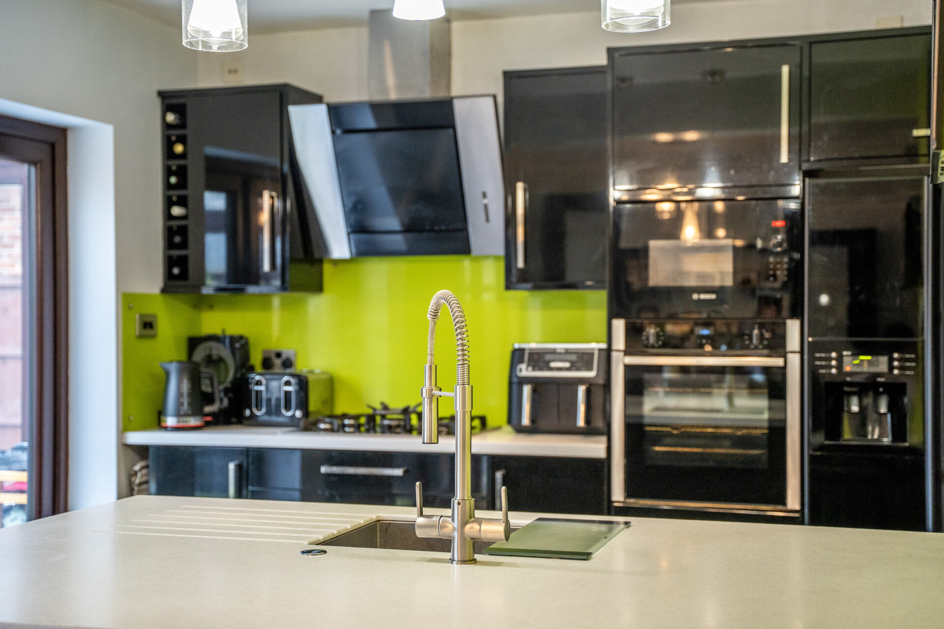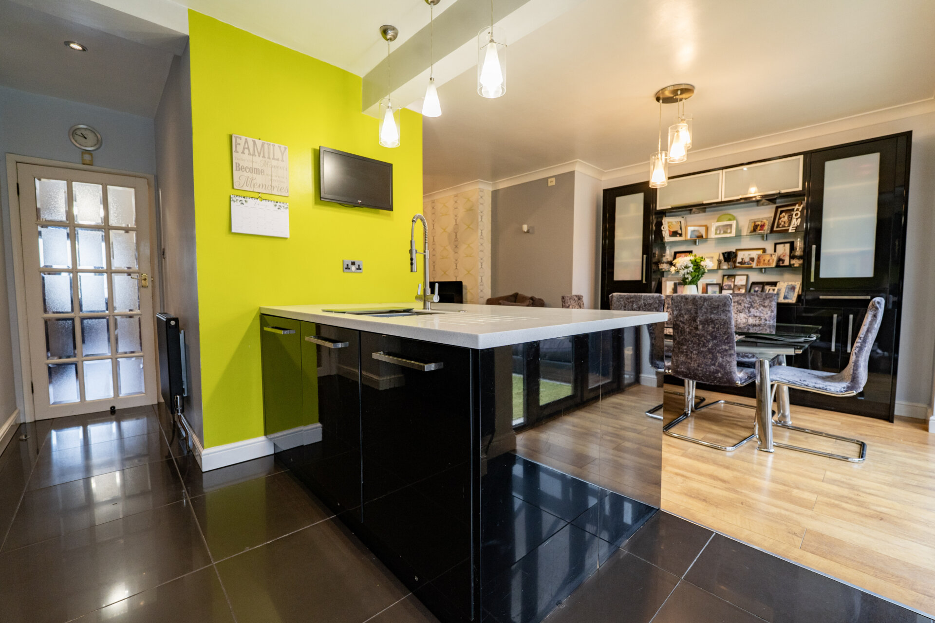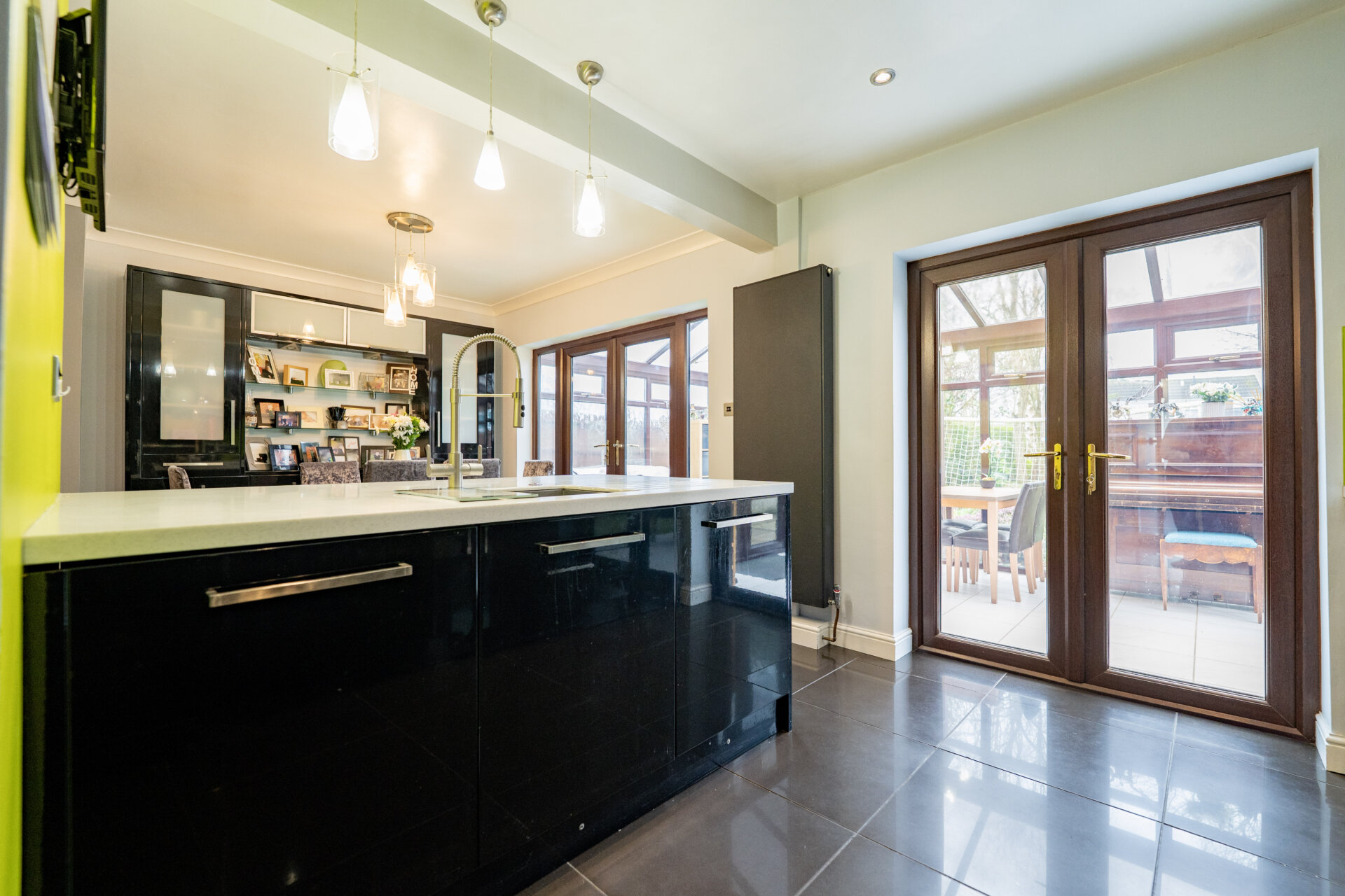 Black, high gloss - wall, base and drawer units with work surface over, built-in Neff eye level oven, 5 ring gas hob with extractor hood over, built-in Bosch microwave, vertical modern radiator, tiled floor, space for fridge/freezer, island which incudes sink and drainer with mixer tap over, built-in washing machine and dishwasher, coving to the ceiling, patio doors to the conservatory, spot lights.