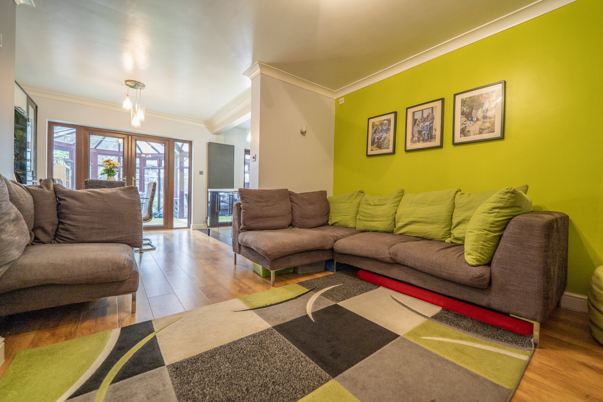 Laminate floor, floating gas fire, coving to the ceiling, UPVC double glazed window.