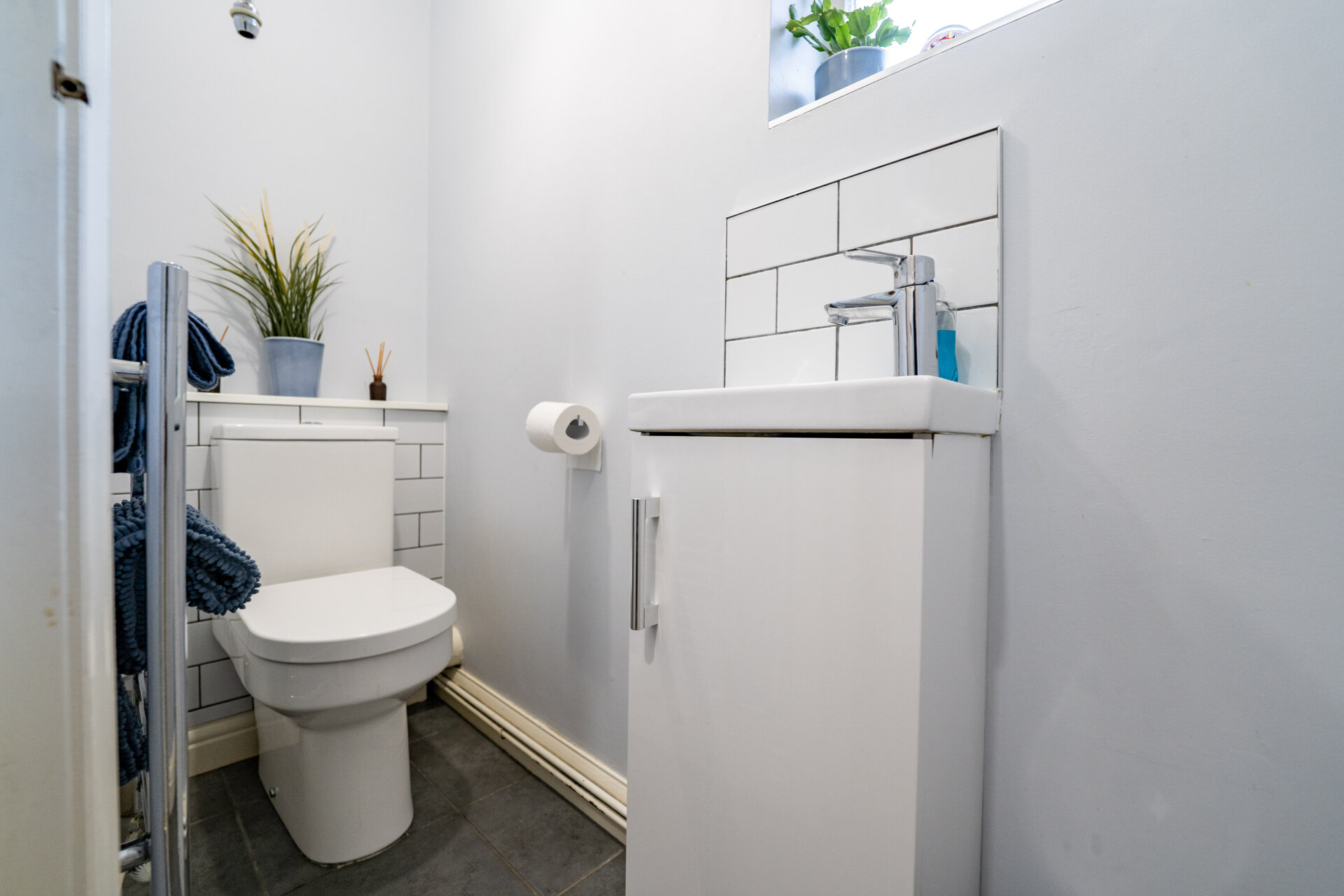 Low flush w.c, sink, splashbacks, UPVC double glazed window, chrome heated towel rail, tiled floor.