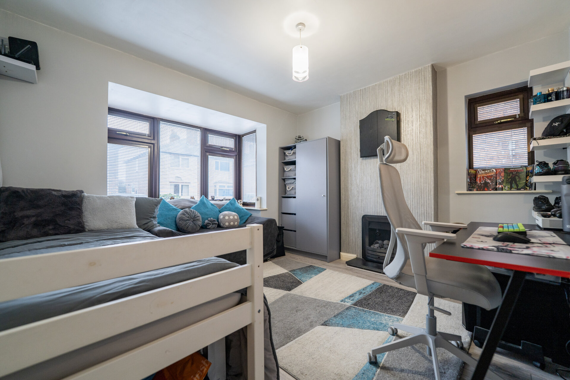 UPVC double glazed bay window and window to the side, gas fire, radiator, laminate floor.