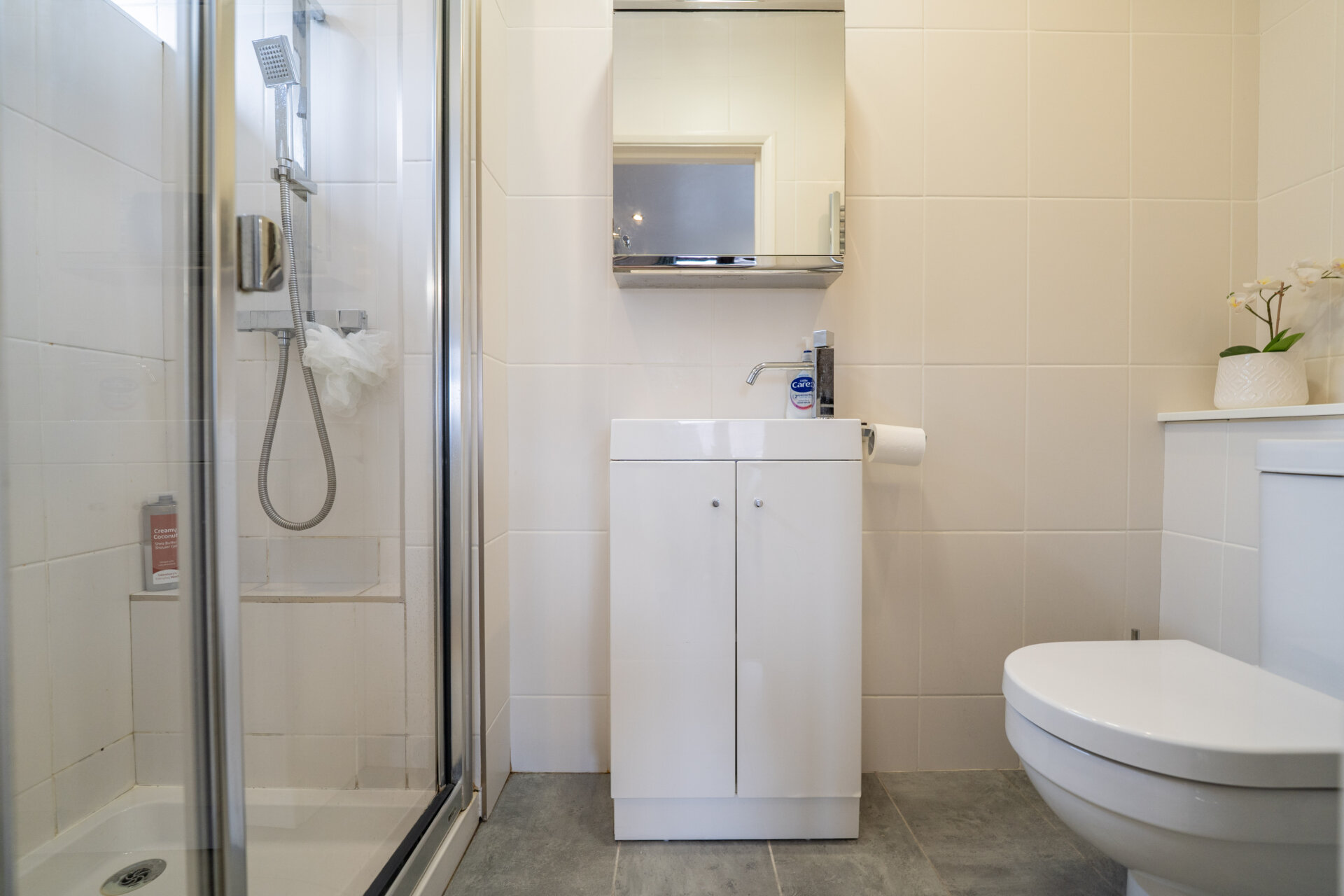 Walk-in shower cubicle with shower from the mains, sink with storage, low flush w.c, fully tiled walls and splashbacks, tiled floor, spotlights, chrome heated towel rail, UPVC double glazed window.