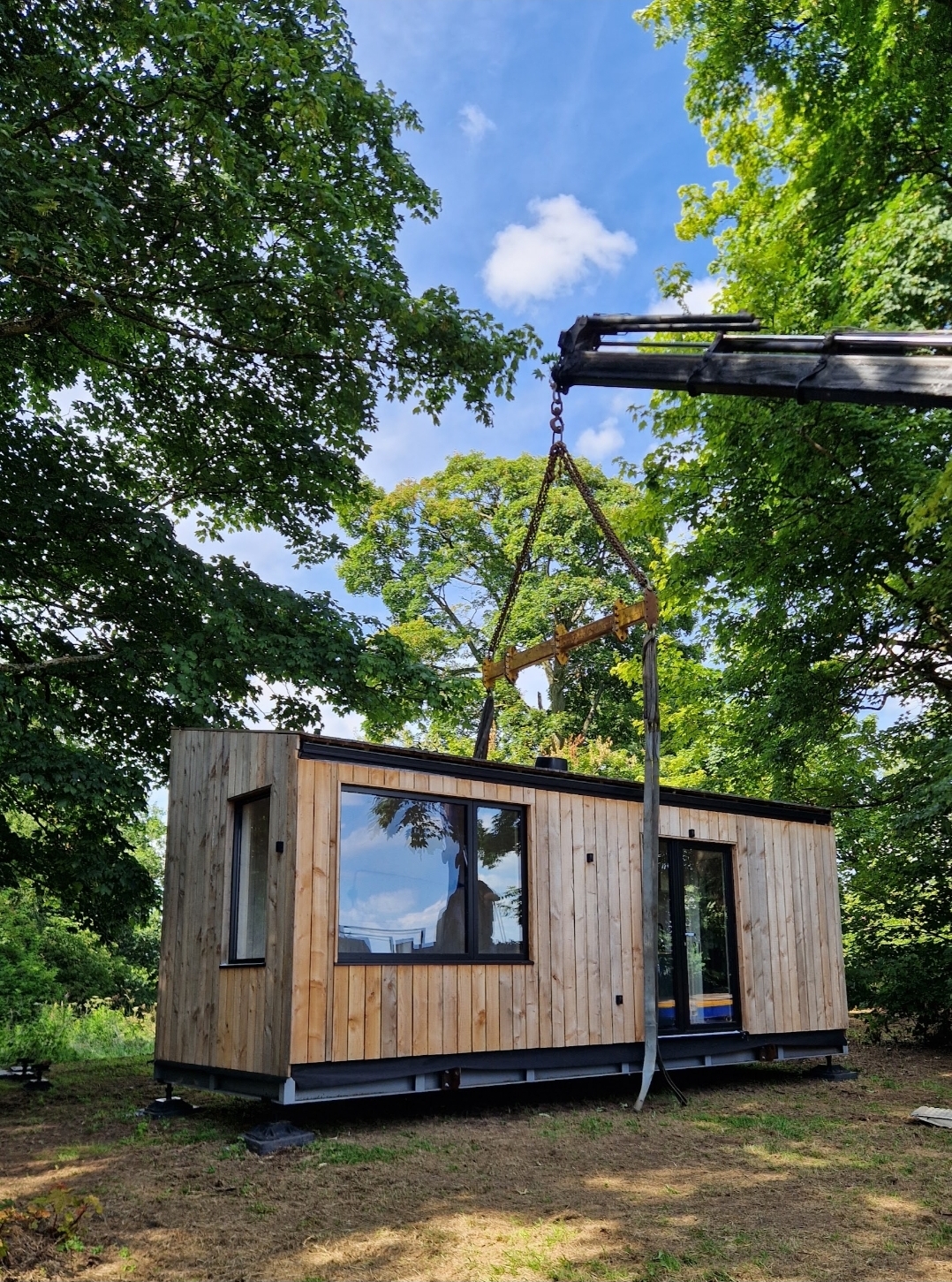 3.6m high, 2.8m long, 7.3m wide log cabin with sitting, sleeping, and kitchen areas. Off-grid solar power, gas boiler, and fixtures included. Relocation help available.