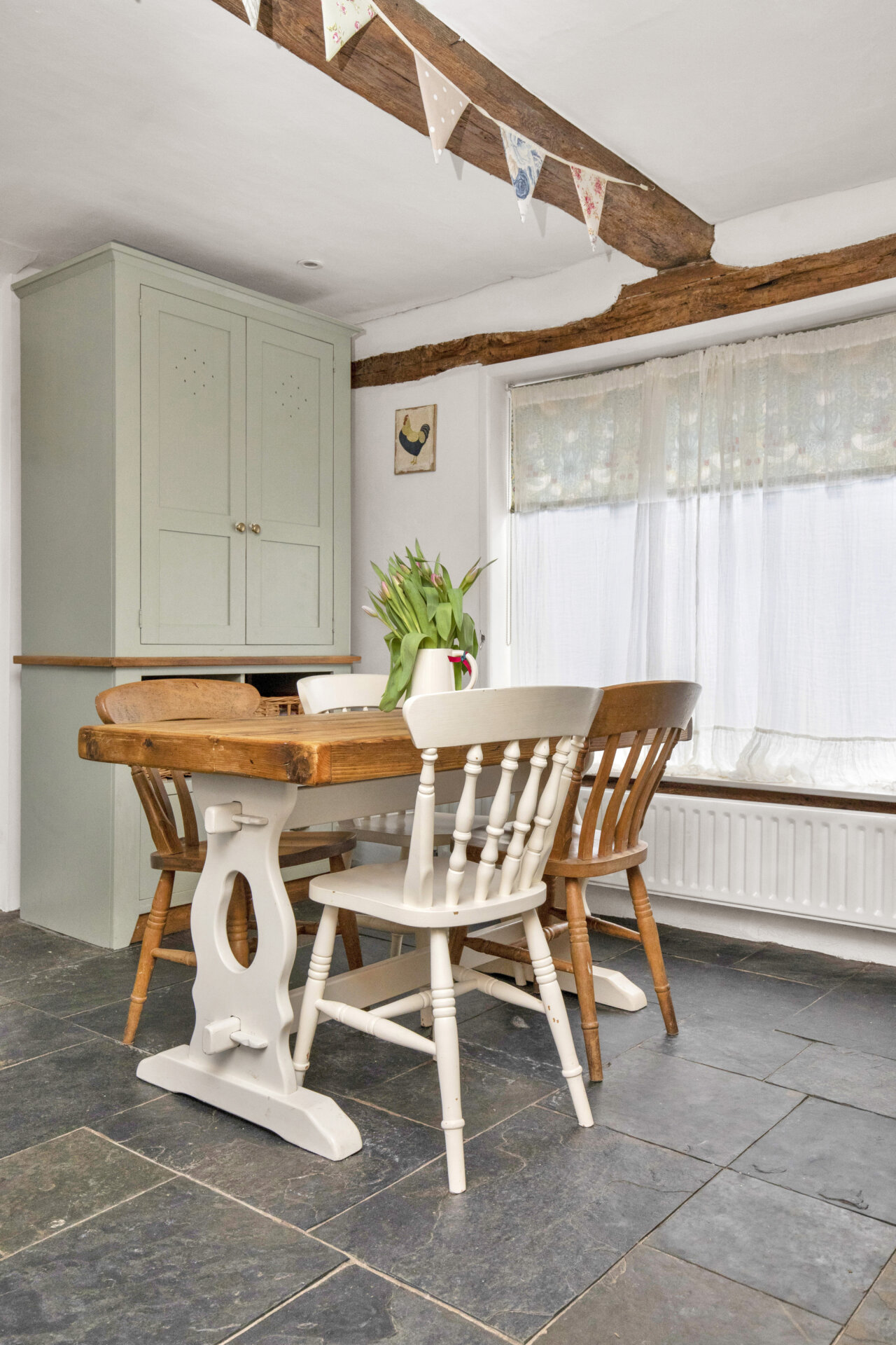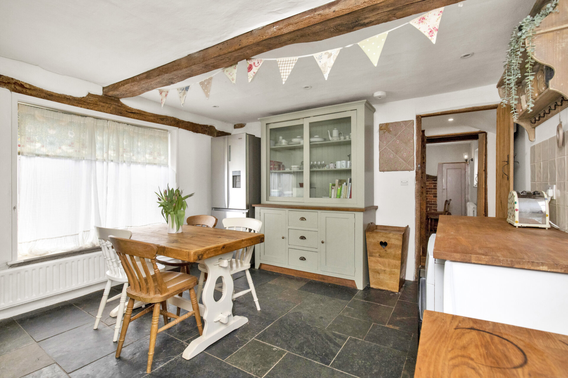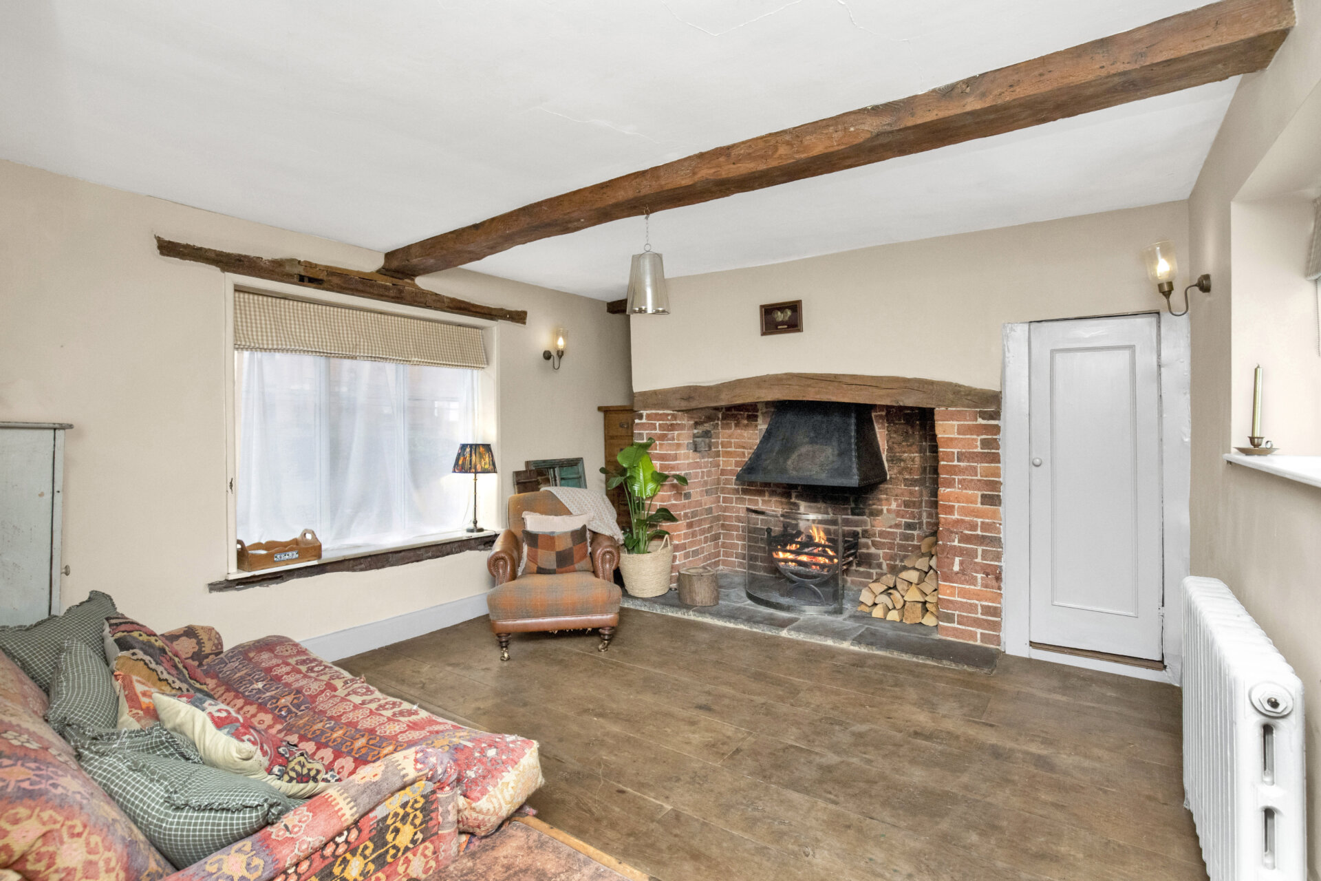 As you step through the front door, you are greeted by a welcoming entrance hall that flows into a spacious, double-aspect living room. This charming room features a striking Inglenook fireplace and exposed wooden beams. The kitchen, equipped with a Rangemaster cooker nestled perfectly in its designated alcove, offers ample space for both cooking and entertaining comfortably seating six, and has picturesque views over the rear garden and beyond.