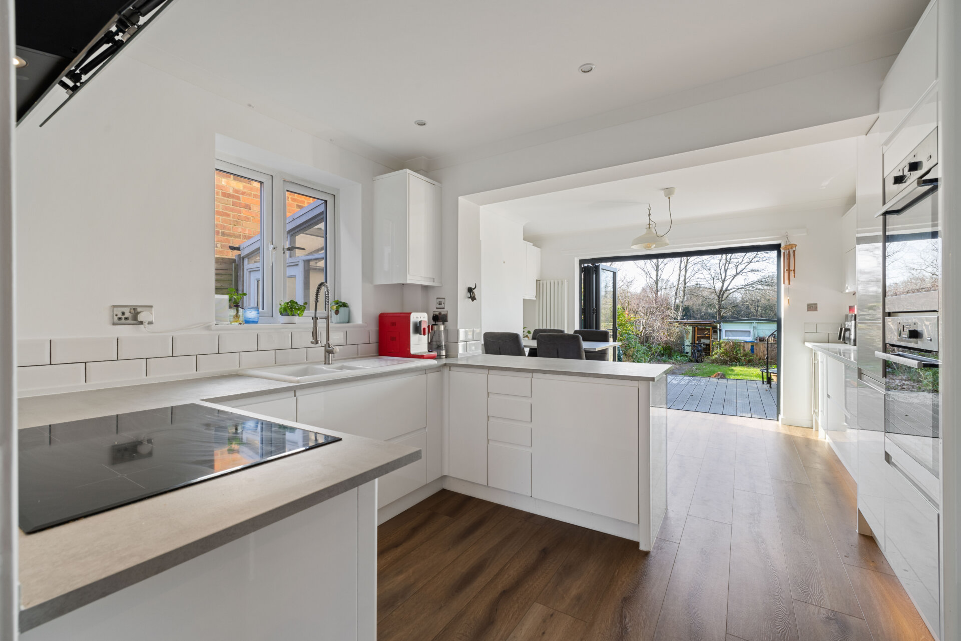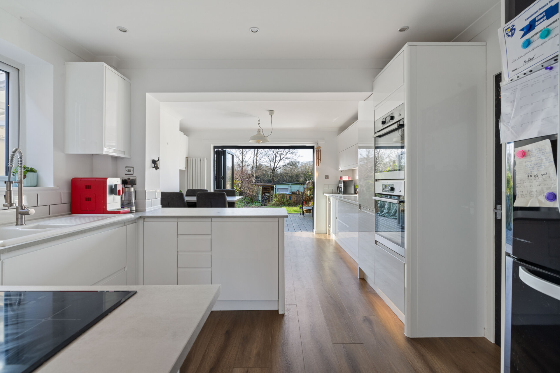 The ground floor forms part of a double storey extension completed in 2020, creating a spacious open plan kitchen and dining room that perfectly suits modern living. This bright and sociable area features bifold doors opening directly onto the west facing rear garden, allowing natural light to flood the space and providing a seamless flow for entertaining or relaxed family time.