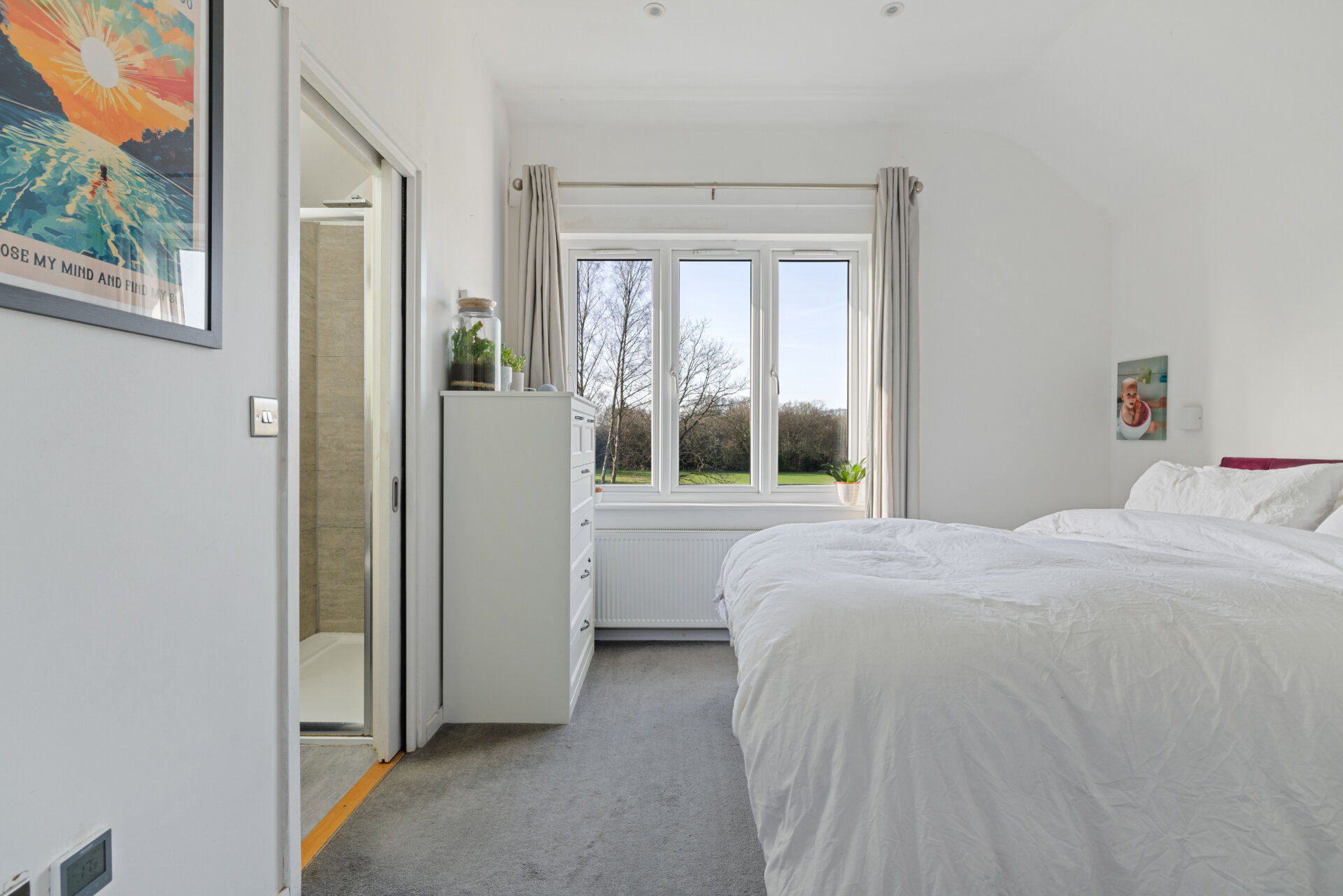 Upstairs, the double storey extension has created a wonderful principal bedroom, beautifully positioned with a large window overlooking the rear garden and Camelsdale Recreation Ground, allowing for a lovely open outlook. This room is further enhanced by a modern en-suite shower room.