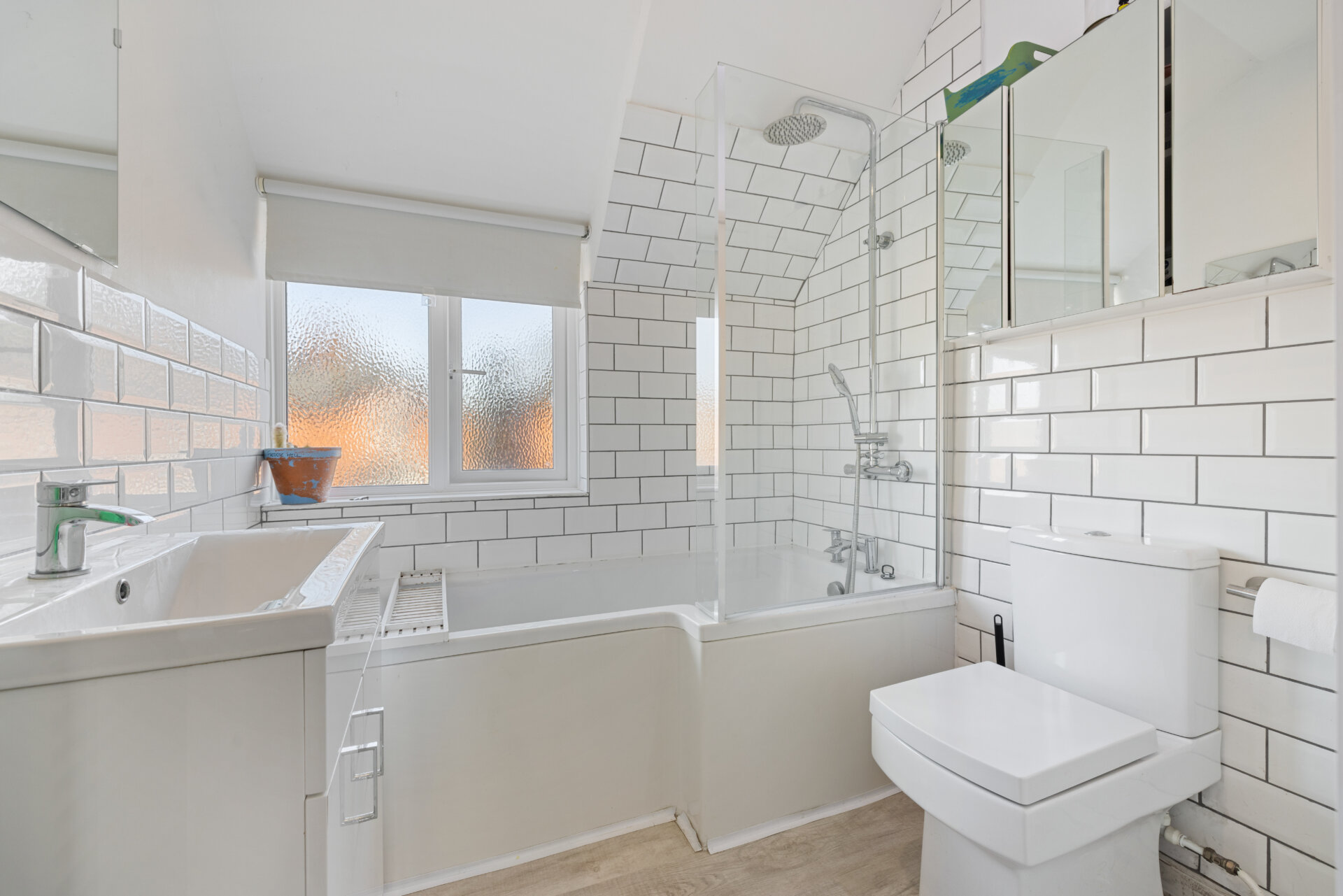 There are two additional double bedrooms, one benefiting from a smaller window and light tunnel, and the other situated at the front of the property with a built in storage cupboard. The family bathroom is finished with stylish metro tile detailing and features a panel enclosed bath with overhead rainfall shower and a generous storage cupboard.